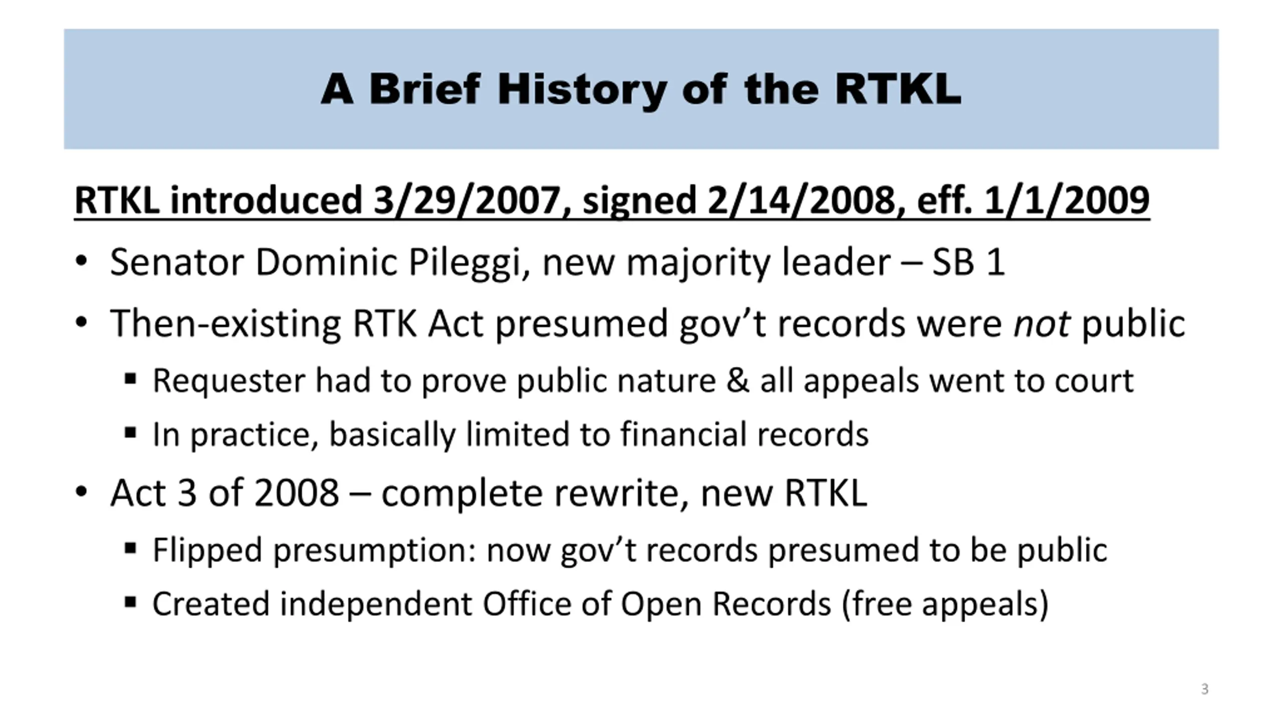 A Brief History of the RTKL RTKL introduced 3/29/2007, signed 2/14/2008, eff. 1/1/2009 Senator Dominic Pileggi, new majority leader SB 1 Then-existing RTK Act presumed gov t records were not public Requester had to prove public nature & all appeals went to court In practice, basically limited to financial records Act 3 of 2008 complete rewrite, new RTKL Flipped presumption: now gov t records presumed to be public Created independent Office of Open Records (free appeals) 3