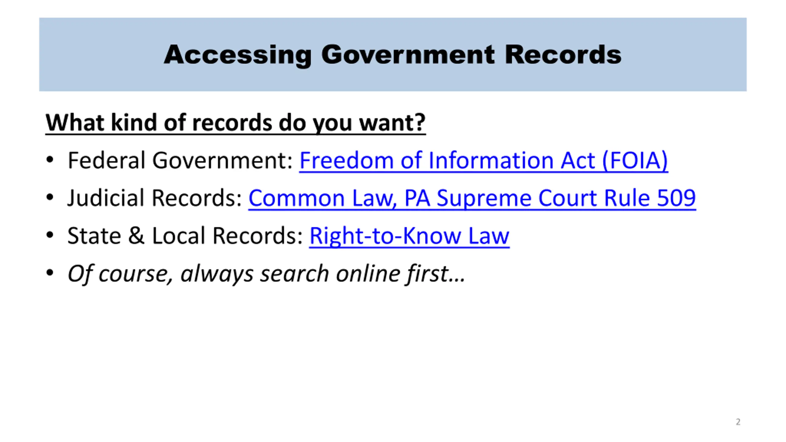 Accessing Government Records What kind of records do you want? Federal Government: Freedom of Information Act (FOIA) Judicial Records: Common Law, PA Supreme Court Rule 509 State & Local Records: Right-to-Know Law Of course, always search online first 2