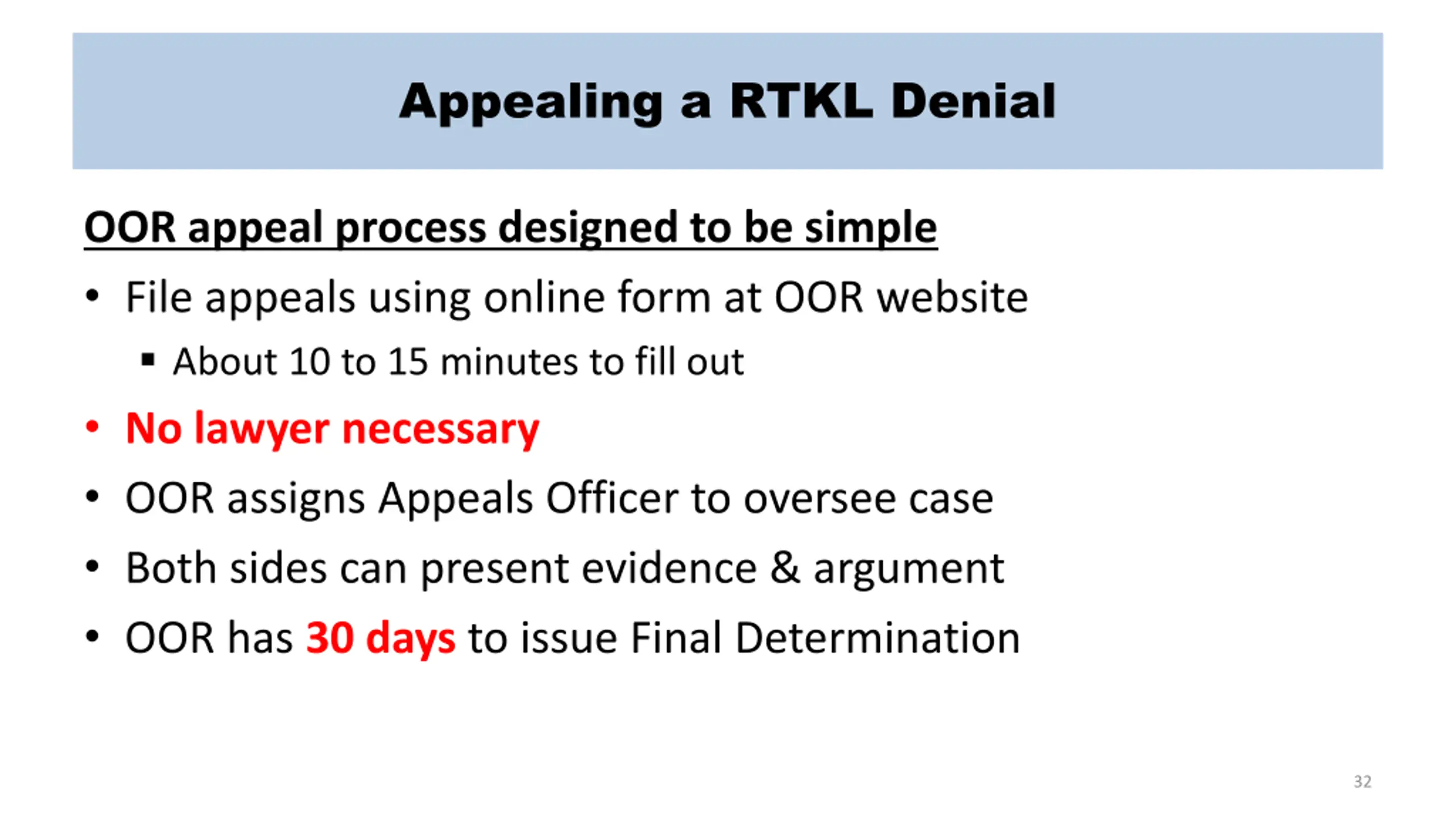 Appealing a RTKL Denial OOR appeal process designed to be simple File appeals using online form at OOR website About 10 to 15 minutes to fill out No lawyer necessary OOR assigns Appeals Officer to oversee case Both sides can present evidence & argument OOR has 30 days to issue Final Determination 32