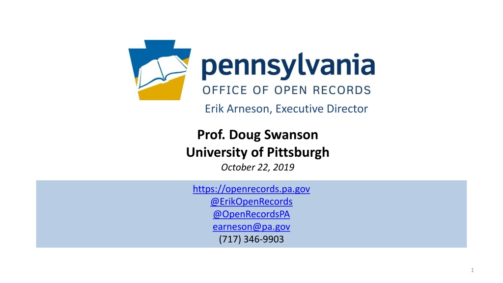 Erik Arneson, Executive Director Prof. Doug Swanson University of Pittsburgh October 22, 2019 https://openrecords.pa.gov @ErikOpenRecords @OpenRecordsPA earneson@pa.gov (717) 346-9903 1