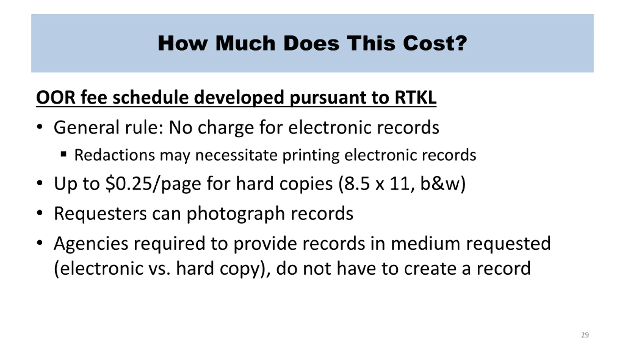 How Much Does This Cost? OOR fee schedule developed pursuant to RTKL General rule: No charge for electronic records Redactions may necessitate printing electronic records Up to $0.25/page for hard copies (8.5 x 11, b&w) Requesters can photograph records Agencies required to provide records in medium requested (electronic vs. hard copy), do not have to create a record 29