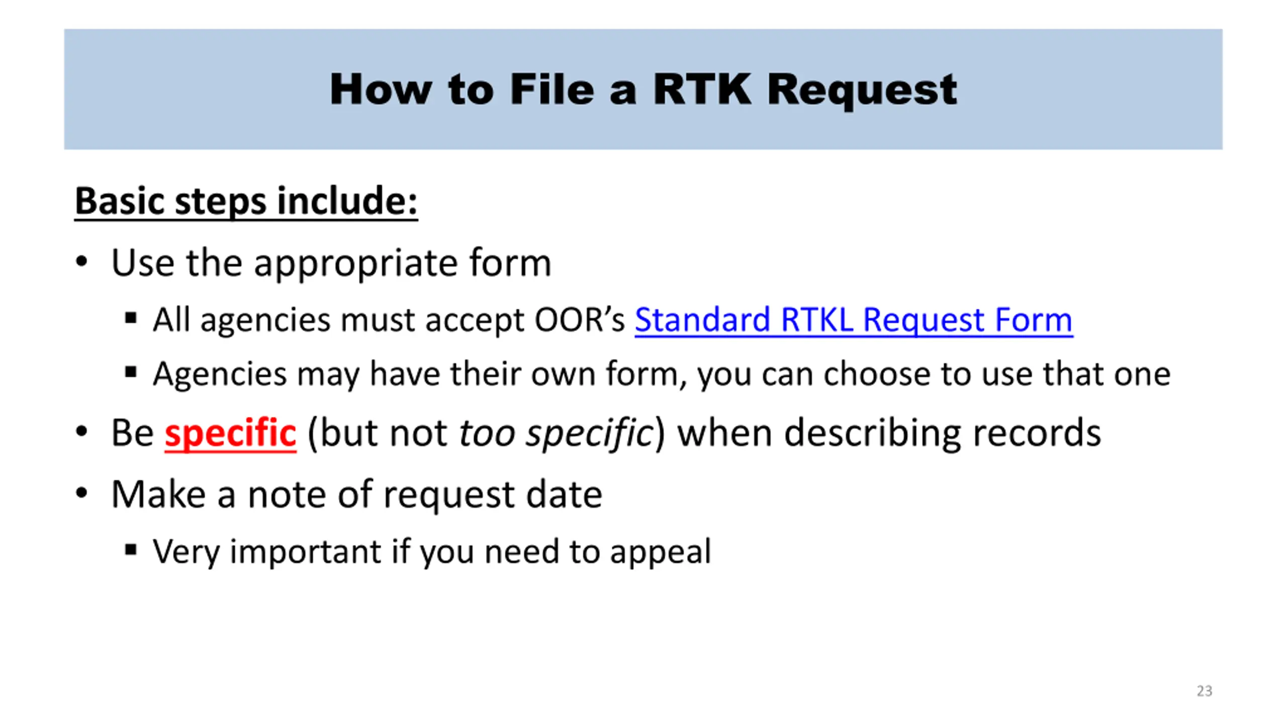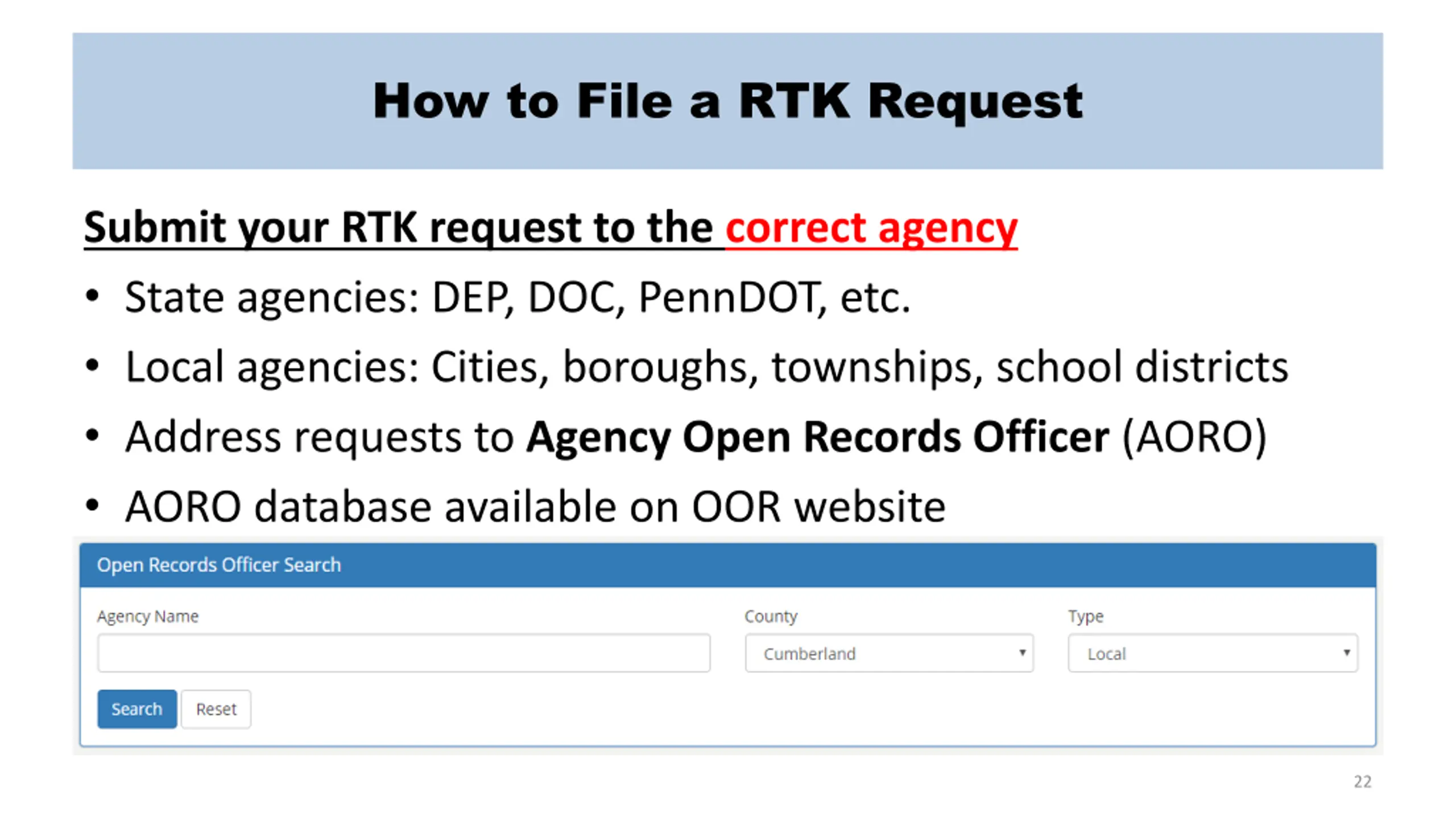 How to File a RTK Request Submit your RTK request to the correct agency State agencies: DEP, DOC, PennDOT, etc. Local agencies: Cities, boroughs, townships, school districts Address requests to Agency Open Records Officer (AORO) AORO database available on OOR website 22
