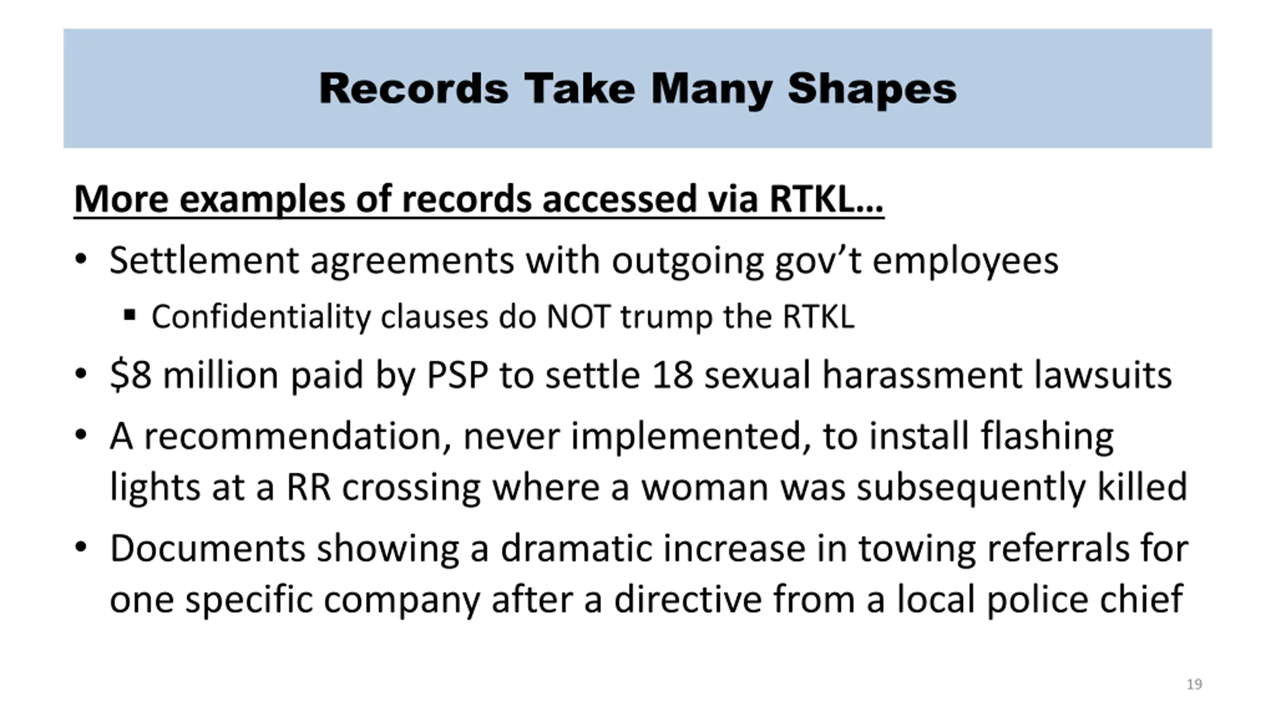 Records Take Many Shapes More examples of records accessed via RTKL Settlement agreements with outgoing gov t employees Confidentiality clauses do NOT trump the RTKL $8 million paid by PSP to settle 18 sexual harassment lawsuits A recommendation, never implemented, to install flashing lights at a RR crossing where a woman was subsequently killed Documents showing a dramatic increase in towing referrals for one specific company after a directive from a local police chief 19