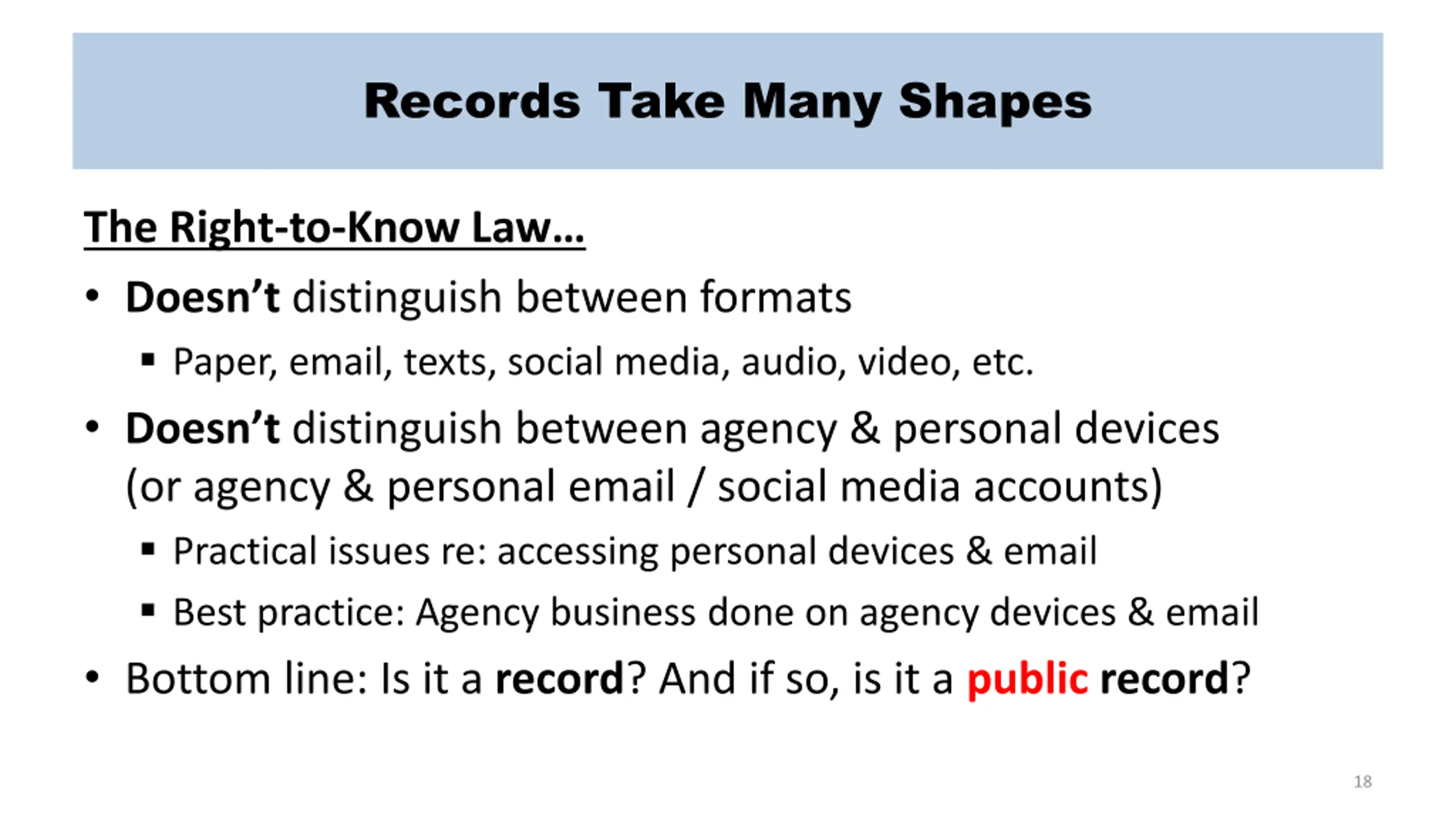 Records Take Many Shapes The Right-to-Know Law Doesn t distinguish between formats Paper, email, texts, social media, audio, video, etc. Doesn t distinguish between agency & personal devices (or agency & personal email / social media accounts) Practical issues re: accessing personal devices & email Best practice: Agency business done on agency devices & email Bottom line: Is it a record? And if so, is it a public record? 18