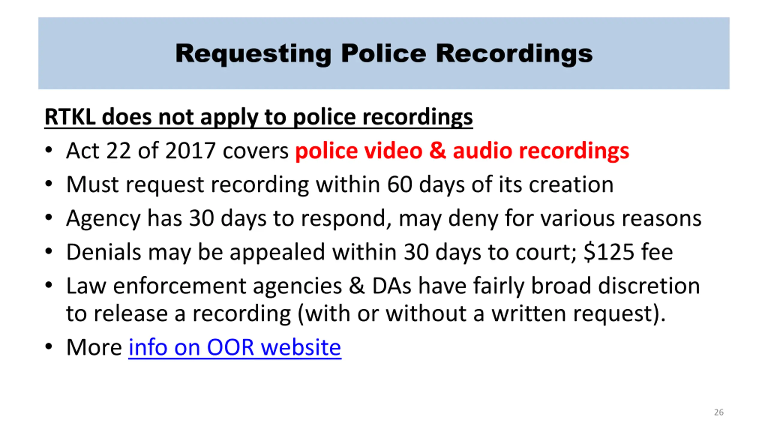 Requesting Police Recordings RTKL does not apply to police recordings Act 22 of 2017 covers police video & audio recordings Must request recording within 60 days of its creation Agency has 30 days to respond, may deny for various reasons Denials may be appealed within 30 days to court; $125 fee Law enforcement agencies & DAs have fairly broad discretion to release a recording (with or without a written request). More info on OOR website 26
