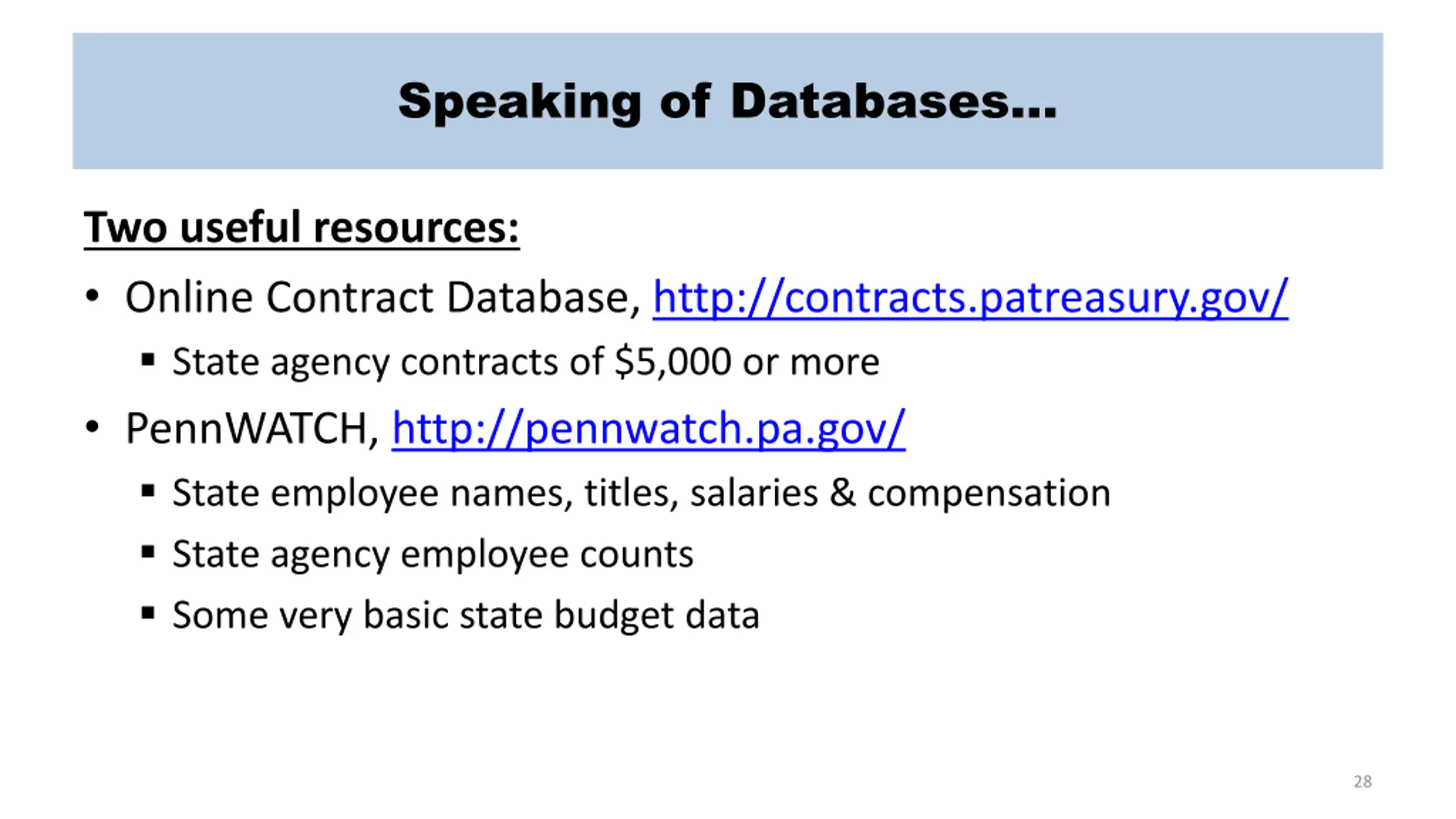 Speaking of Databases Two useful resources: Online Contract Database, http://contracts.patreasury.gov/ State agency contracts of $5,000 or more PennWATCH, http://pennwatch.pa.gov/ State employee names, titles, salaries & compensation State agency employee counts Some very basic state budget data 28