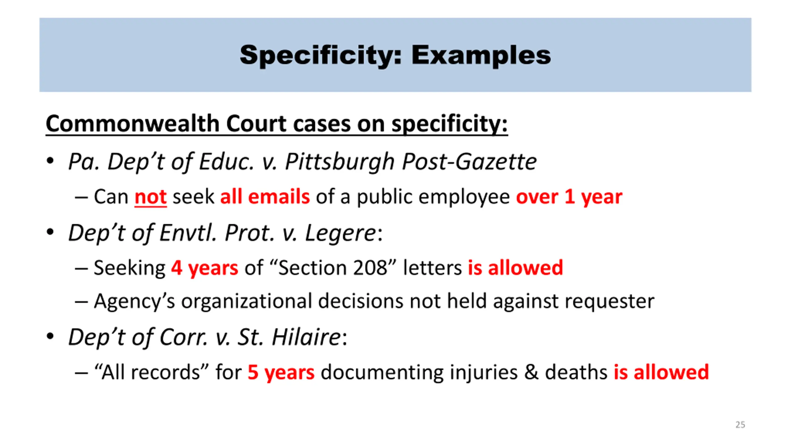 Specificity: Examples Commonwealth Court cases on specificity: Pa. Dep t of Educ. v. Pittsburgh Post-Gazette Can not seek all emails of a public employee over 1 year Dep t of Envtl. Prot. v. Legere: Seeking 4 years of Section 208 letters is allowed Agency s organizational decisions not held against requester Dep t of Corr. v. St. Hilaire: All records for 5 years documenting injuries & deaths is allowed 25