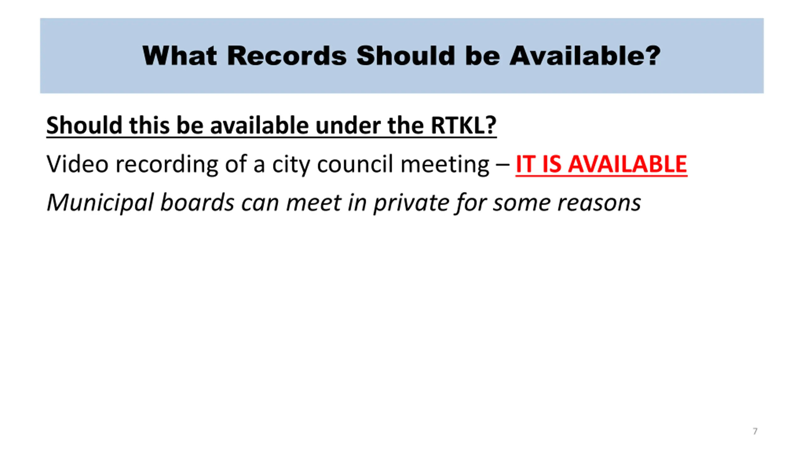 What Records Should be Available? Should this be available under the RTKL? Video recording of a city council meeting IT IS AVAILABLE Municipal boards can meet in private for some reasons 7