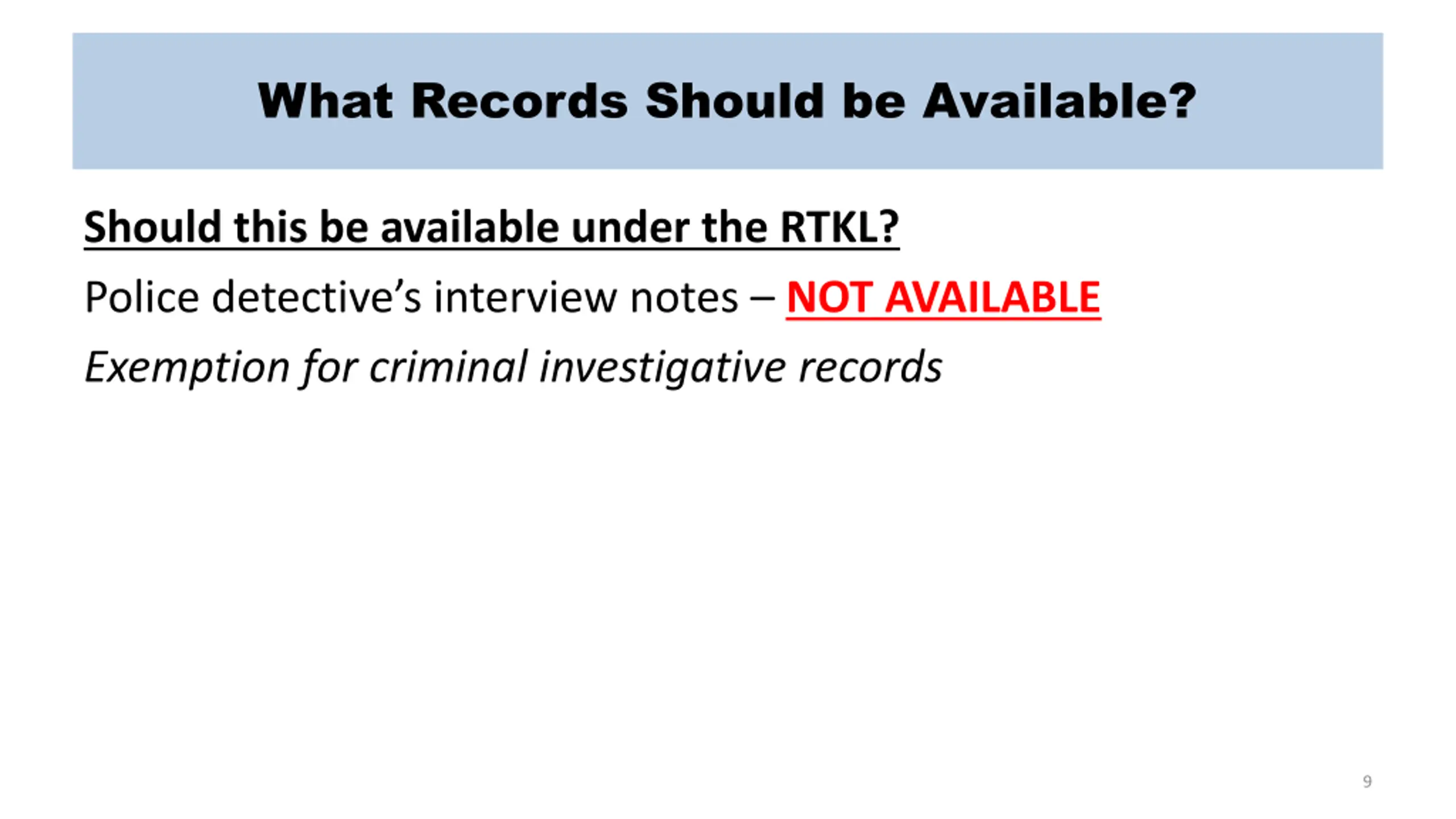 What Records Should be Available? Should this be available under the RTKL? Police detective s interview notes NOT AVAILABLE Exemption for criminal investigative records 9