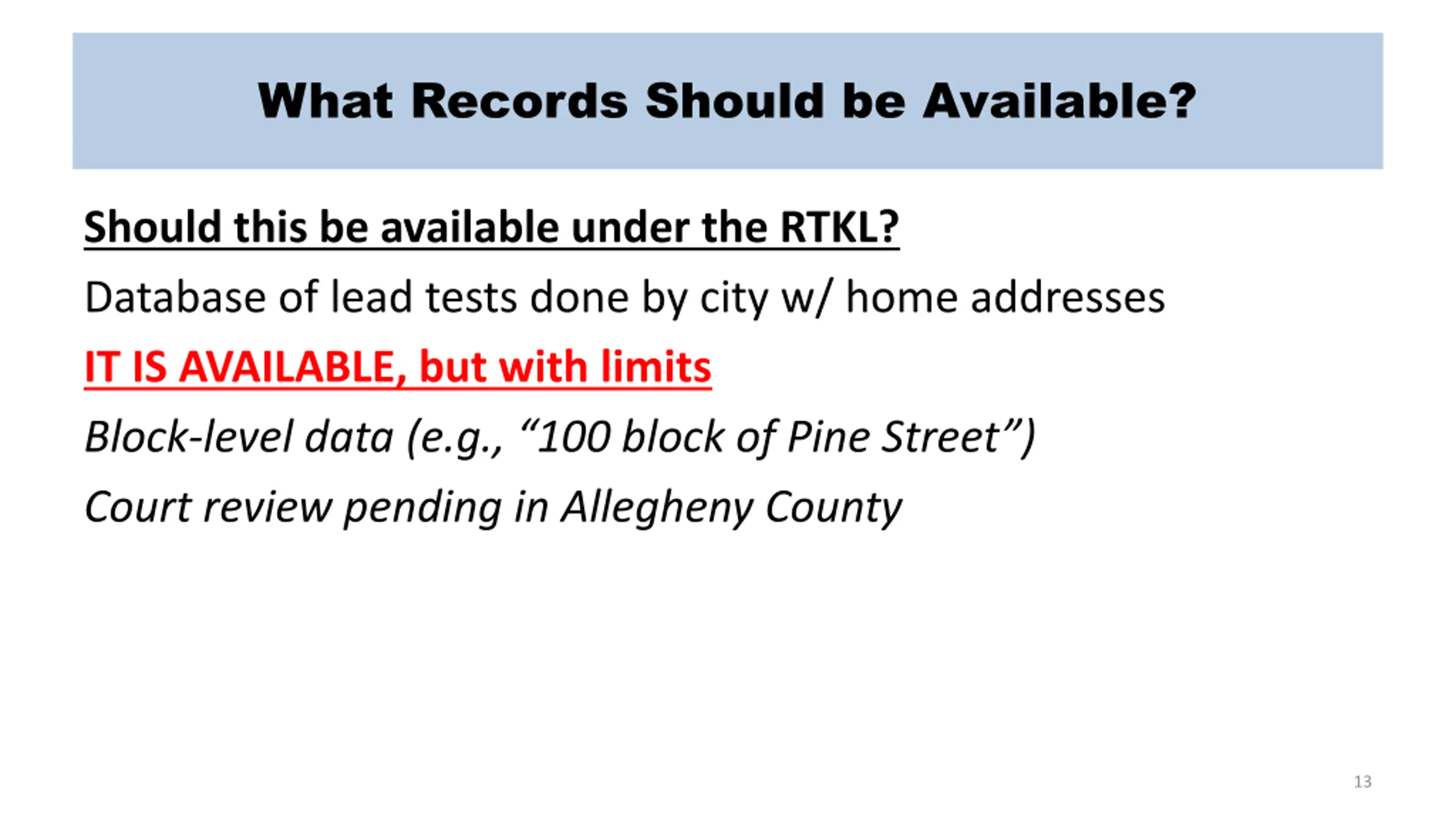 What Records Should be Available? Should this be available under the RTKL? Database of lead tests done by city w/ home addresses 12