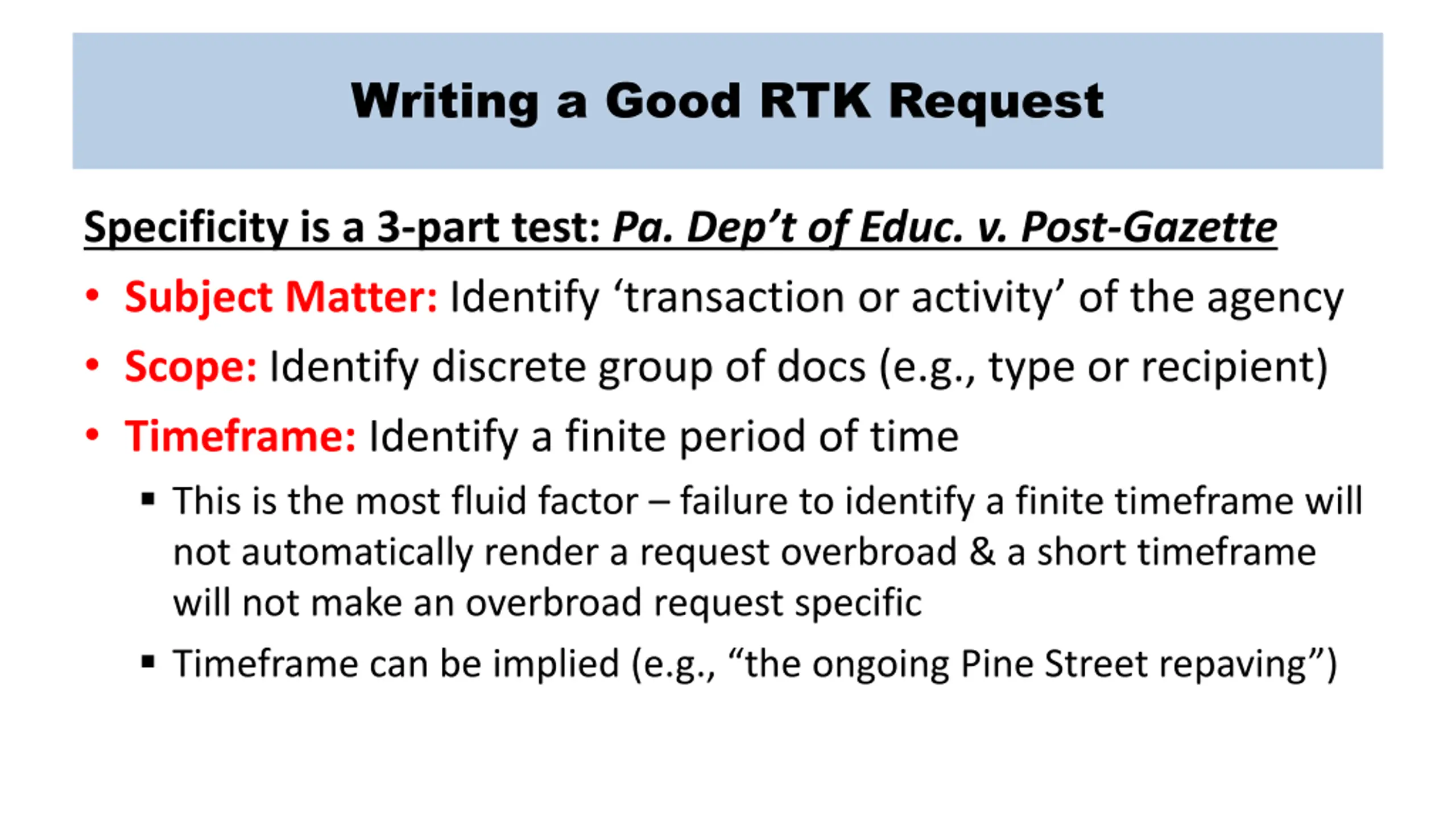 Writing a Good RTK Request Specificity is a 3-part test: Pa. Dep t of Educ. v. Post-Gazette Subject Matter:Identify transaction or activity of the agency Scope: Identify discrete group of docs (e.g., type or recipient) Timeframe: Identify a finite period of time This is the most fluid factor failure to identify a finite timeframe will not automatically render a request overbroad & a short timeframe will not make an overbroad request specific Timeframe can be implied (e.g., the ongoing Pine Street repaving )