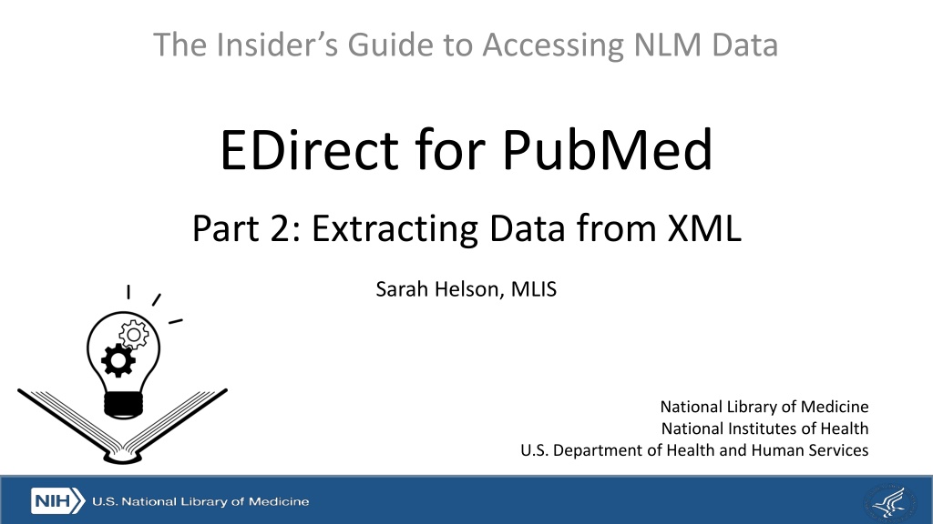 The Insiders Guide to Accessing NLM Data EDirect for PubMed Part 2: Extracting Data from XML Sarah Helson, MLIS National Library of Medicine National Institutes of Health U.S. Department of Health and Human Services