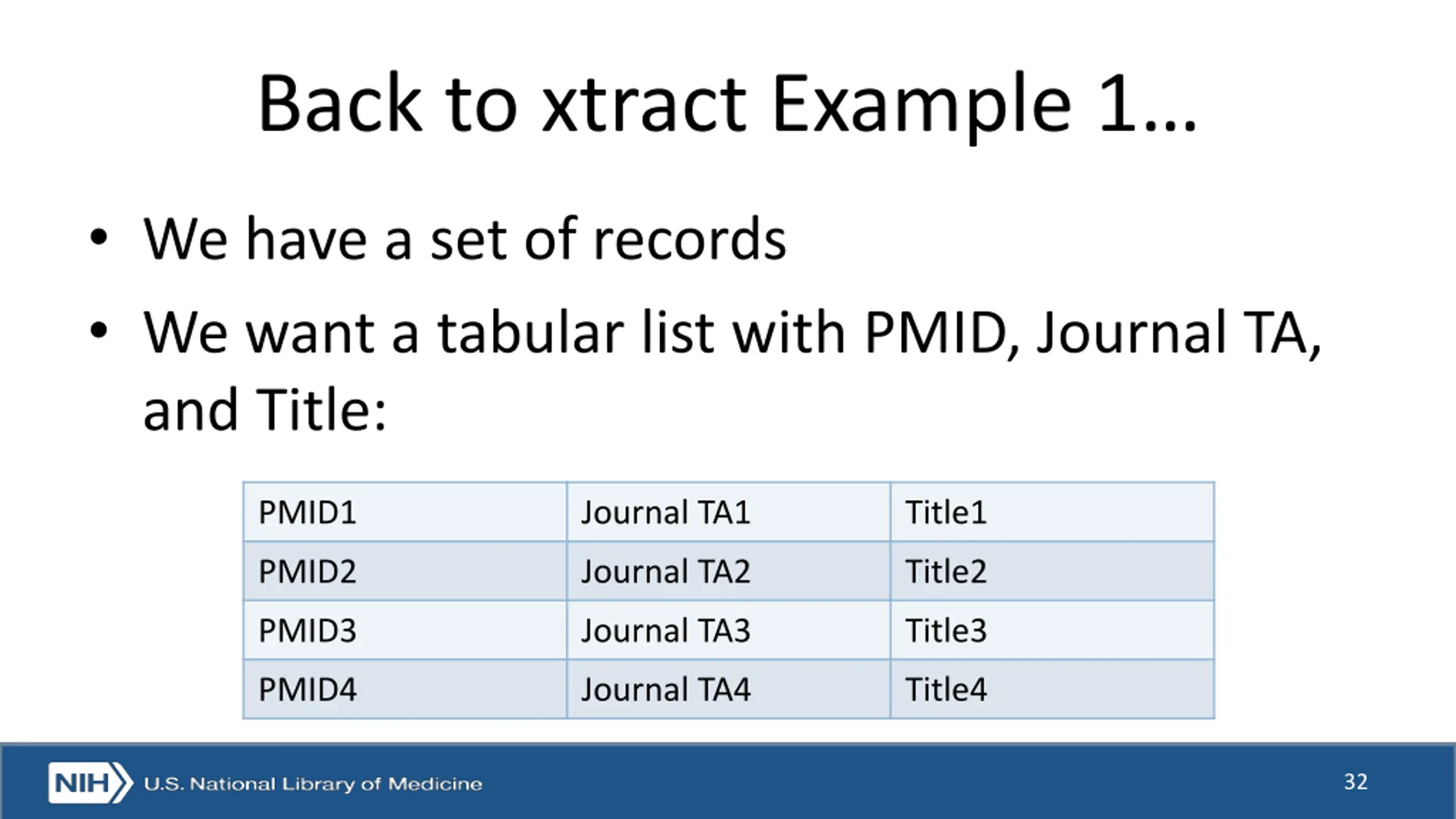 Back to xtract Example 1 We have a set of records We want a tabular list with PMID, Journal TA, and Title: PMID1 Journal TA1 Title1 PMID2 Journal TA2 Title2 PMID3 Journal TA3 Title3 PMID4 Journal TA4 Title4 32