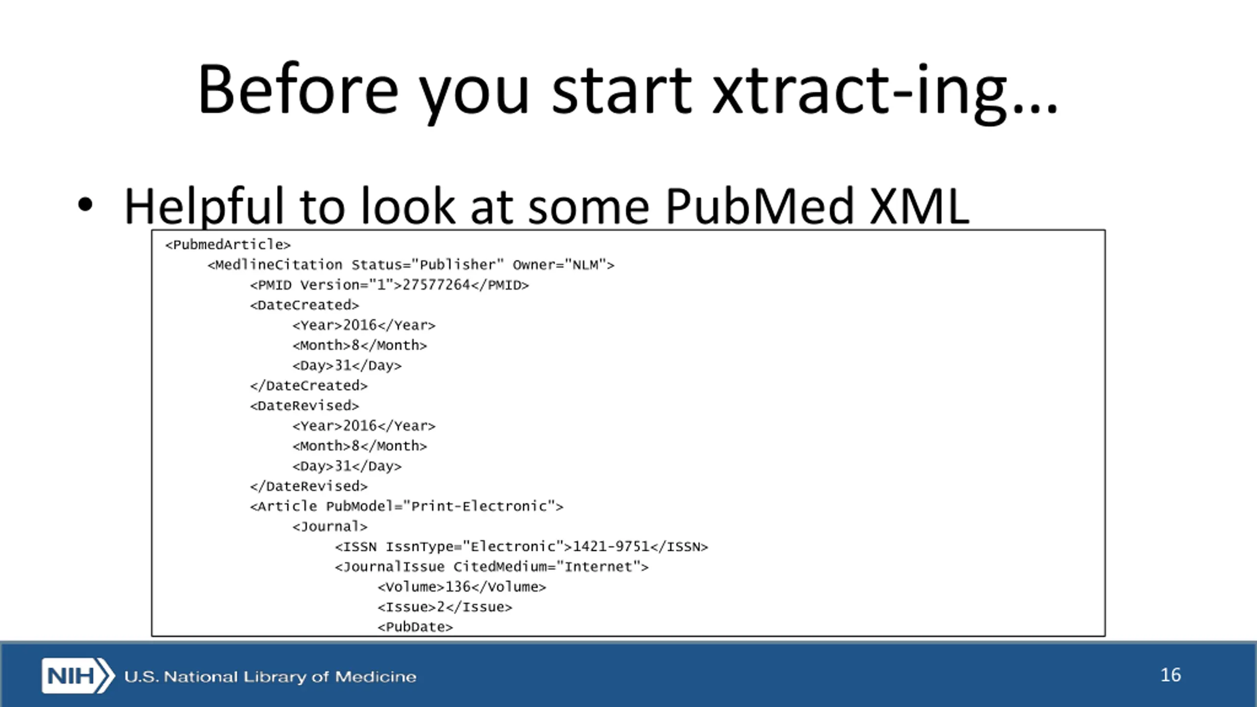 Before you start xtract-ing Helpful to look at some PubMed XML <PubmedArticle> <MedlineCitation Status="Publisher" Owner="NLM"> <PMID Version="1">27577264</PMID> <DateCreated> <Year>2016</Year> <Month>8</Month> <Day>31</Day> </DateCreated> <DateRevised> <Year>2016</Year> <Month>8</Month> <Day>31</Day> </DateRevised> <Article PubModel="Print-Electronic"> <Journal> <ISSN IssnType="Electronic">1421-9751</ISSN> <JournalIssue CitedMedium="Internet"> <Volume>136</Volume> <Issue>2</Issue> <PubDate> 16