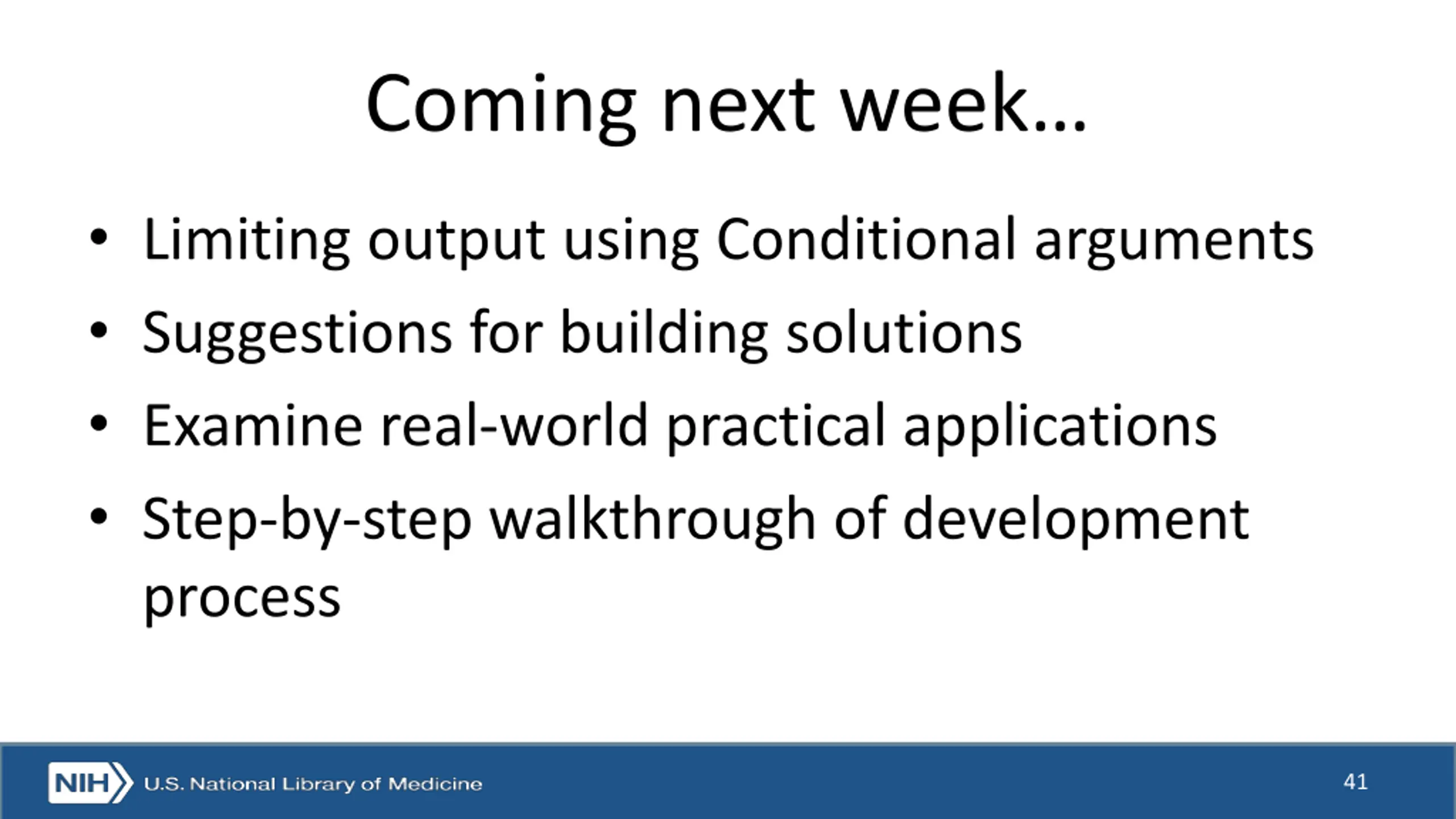 Coming next week Limiting output using Conditional arguments Suggestions for building solutions Examine real-world practical applications Step-by-step walkthrough of development process 41