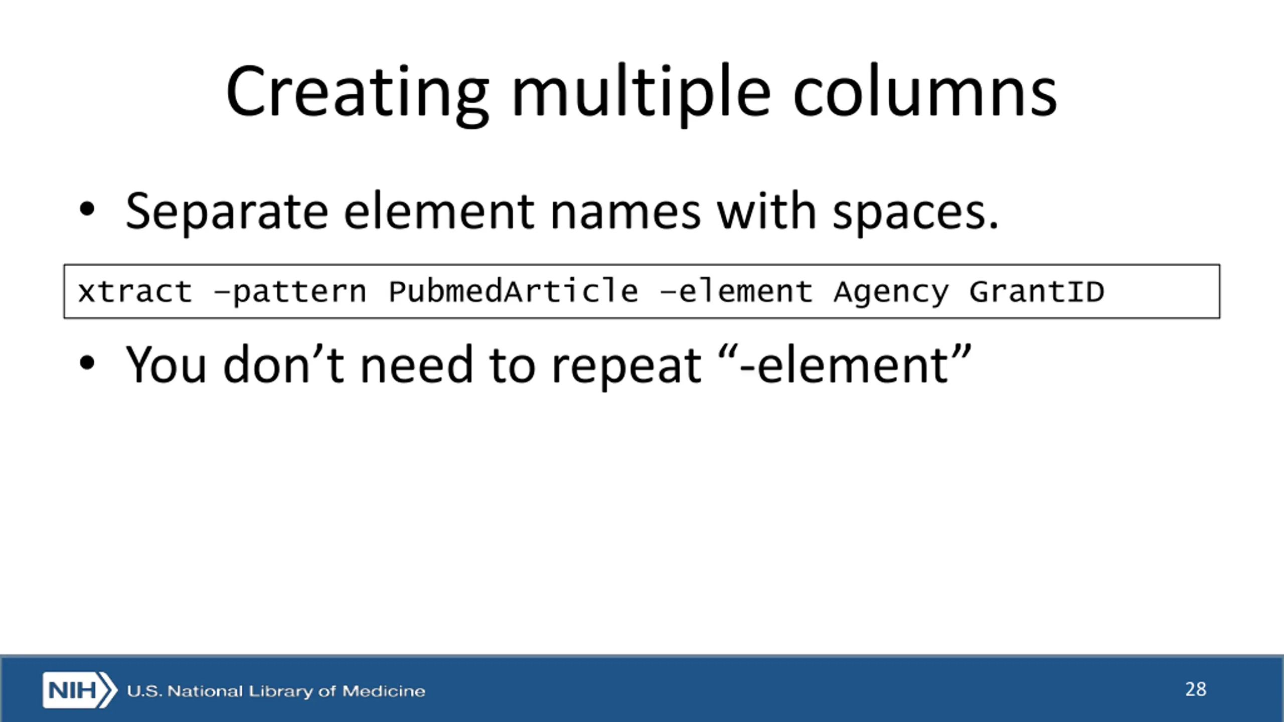 Creating multiple columns Separate element names with spaces. xtract pattern PubmedArticle element Agency GrantID You don t need to repeat -element 28