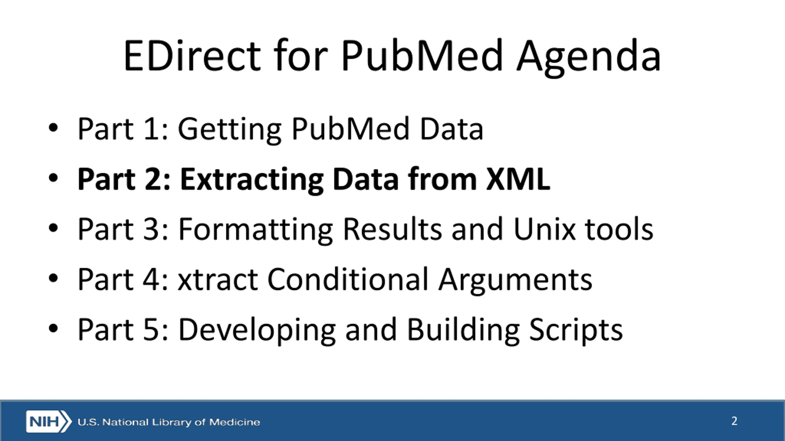 EDirect for PubMed Agenda Part 1: Getting PubMed Data Part 2: Extracting Data from XML Part 3: Formatting Results and Unix tools Part 4: xtract Conditional Arguments Part 5: Developing and Building Scripts 2