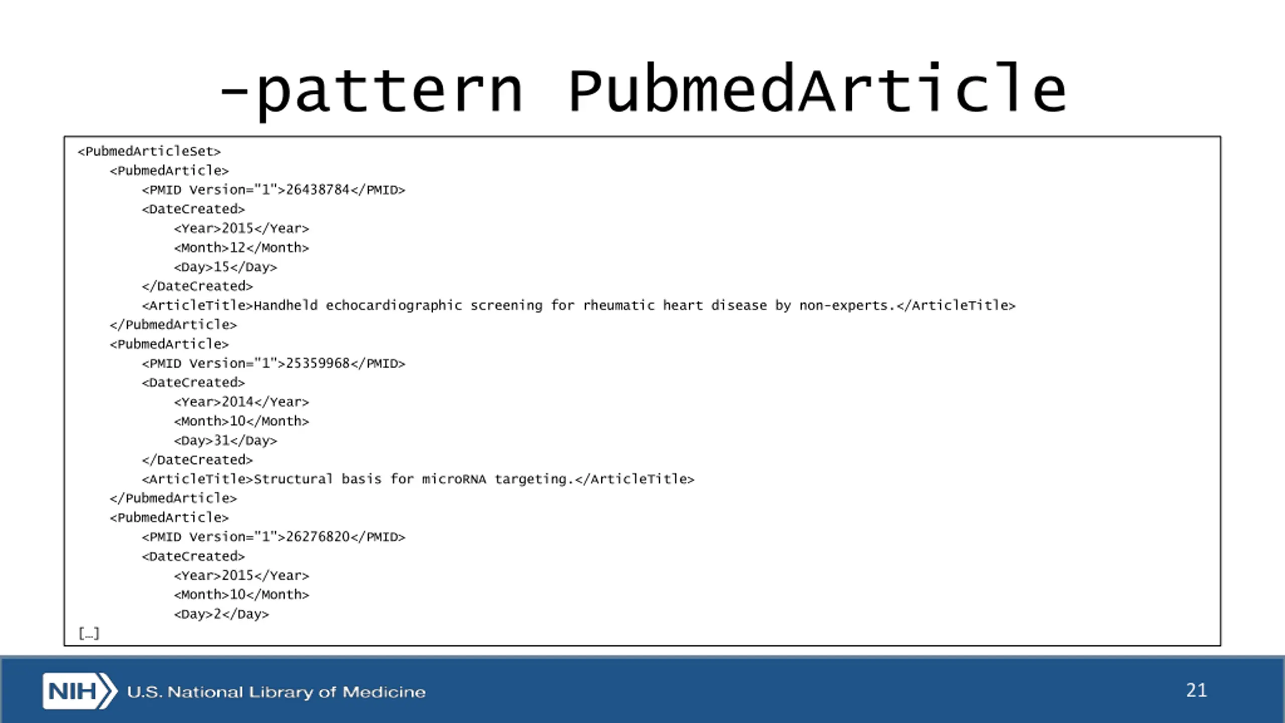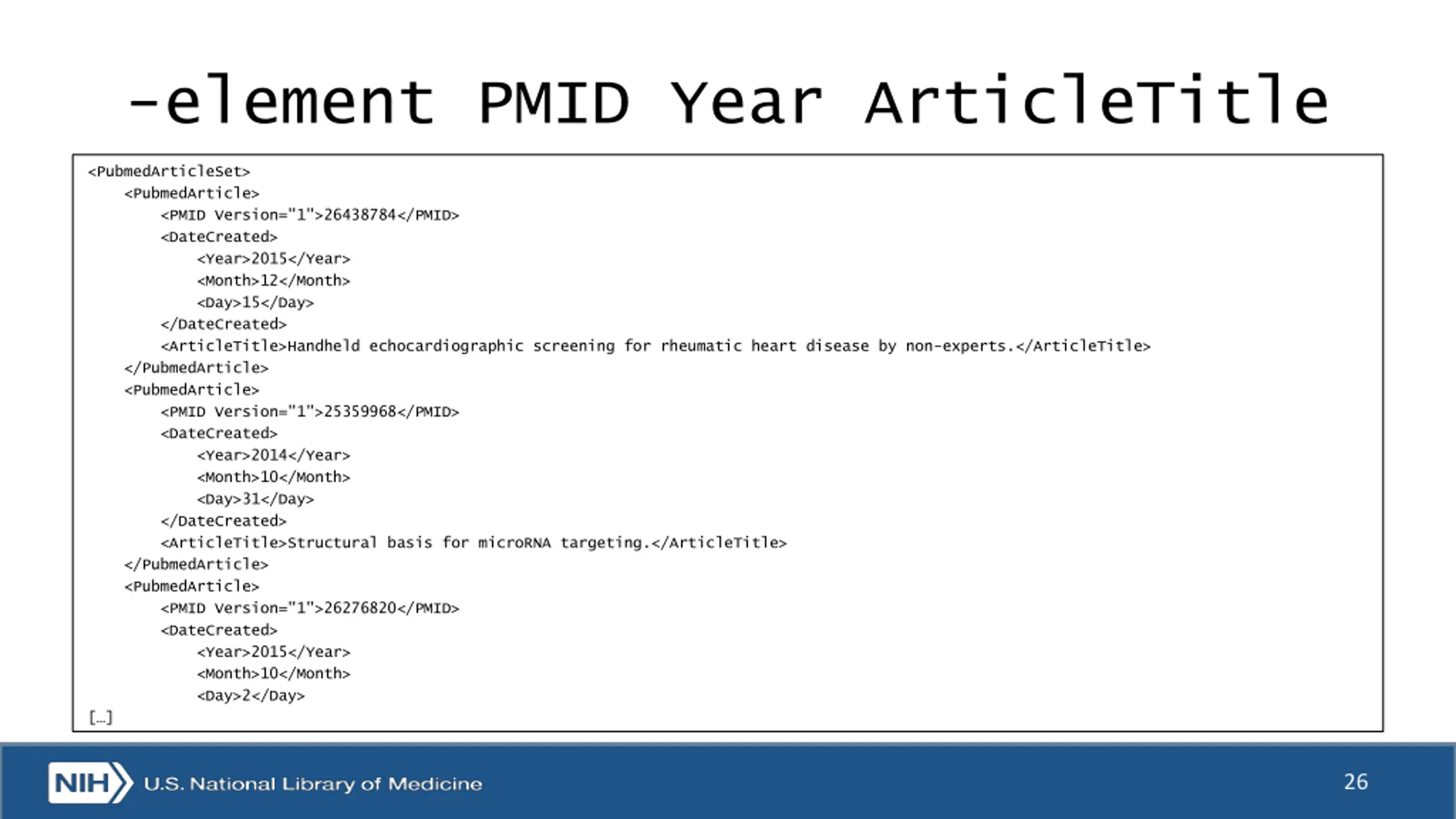 An XML example <PubmedArticleSet> <PubmedArticle> <PMID Version="1">26438784</PMID> <DateCreated> <Year>2015</Year> <Month>12</Month> <Day>15</Day> </DateCreated> <Journal> <ISSN IssnType="Electronic">1468-201X</ISSN> <JournalIssue CitedMedium="Internet"> <Volume>102</Volume> <Issue>1</Issue> <PubDate> <Year>2016</Year> <Month>Jan</Month> </PubDate> </JournalIssue> <Title>Heart (British Cardiac Society)</Title> <ISOAbbreviation>Heart</ISOAbbreviation> </Journal> <ArticleTitle>Handheld echocardiographic screening for rheumatic heart disease by non-experts.</ArticleTitle> <ELocationID EIdType="doi" ValidYN="Y">10.1136/heartjnl-2015-308236</ELocationID> </PubmedArticle> </PubmedArticleSet> 11