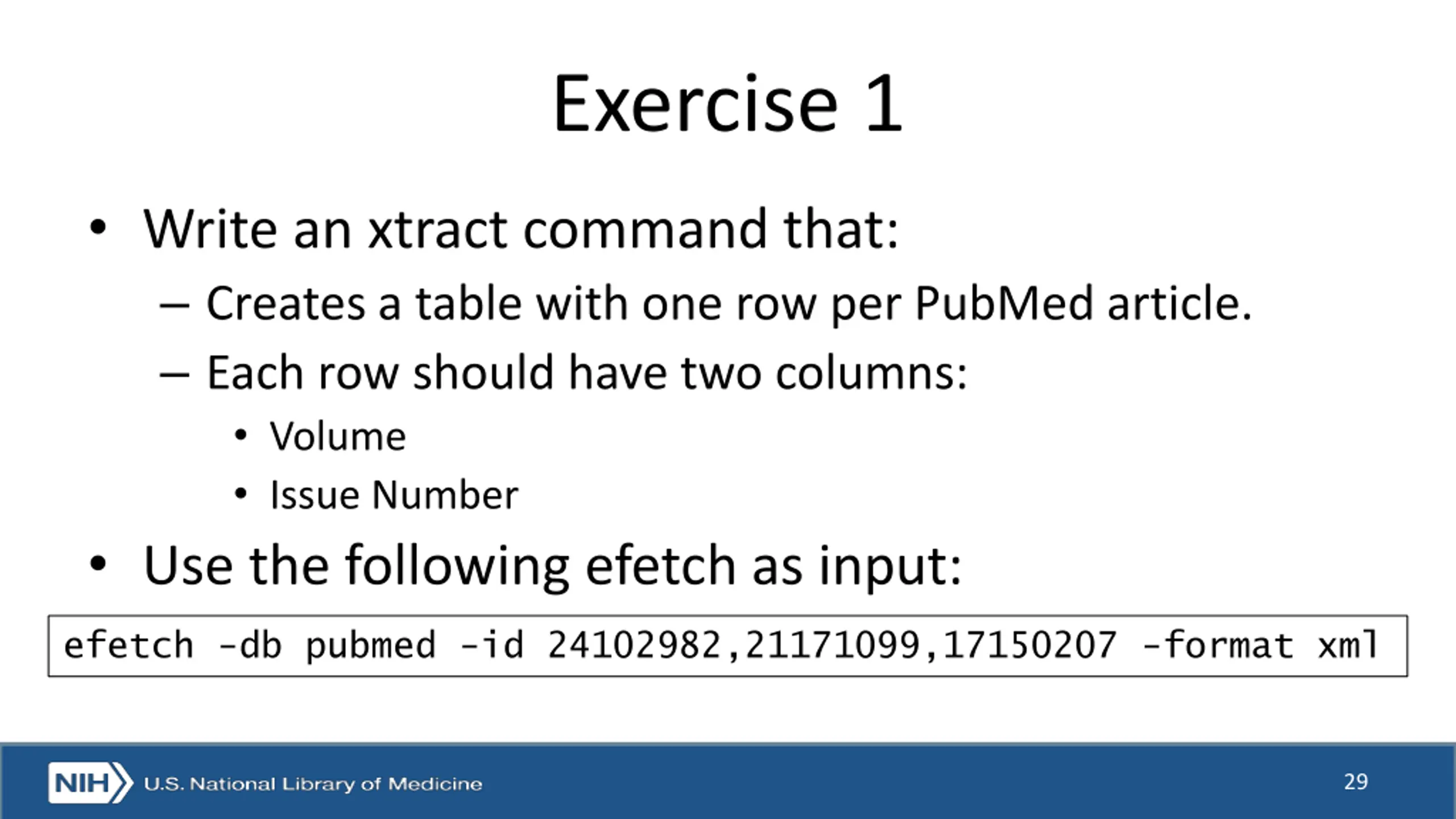 Exercise 1 Write an xtract command that: Creates a table with one row per PubMed article. Each row should have two columns: Volume Issue Number Use the following efetch as input: efetch -db pubmed -id 24102982,21171099,17150207 -format xml 29