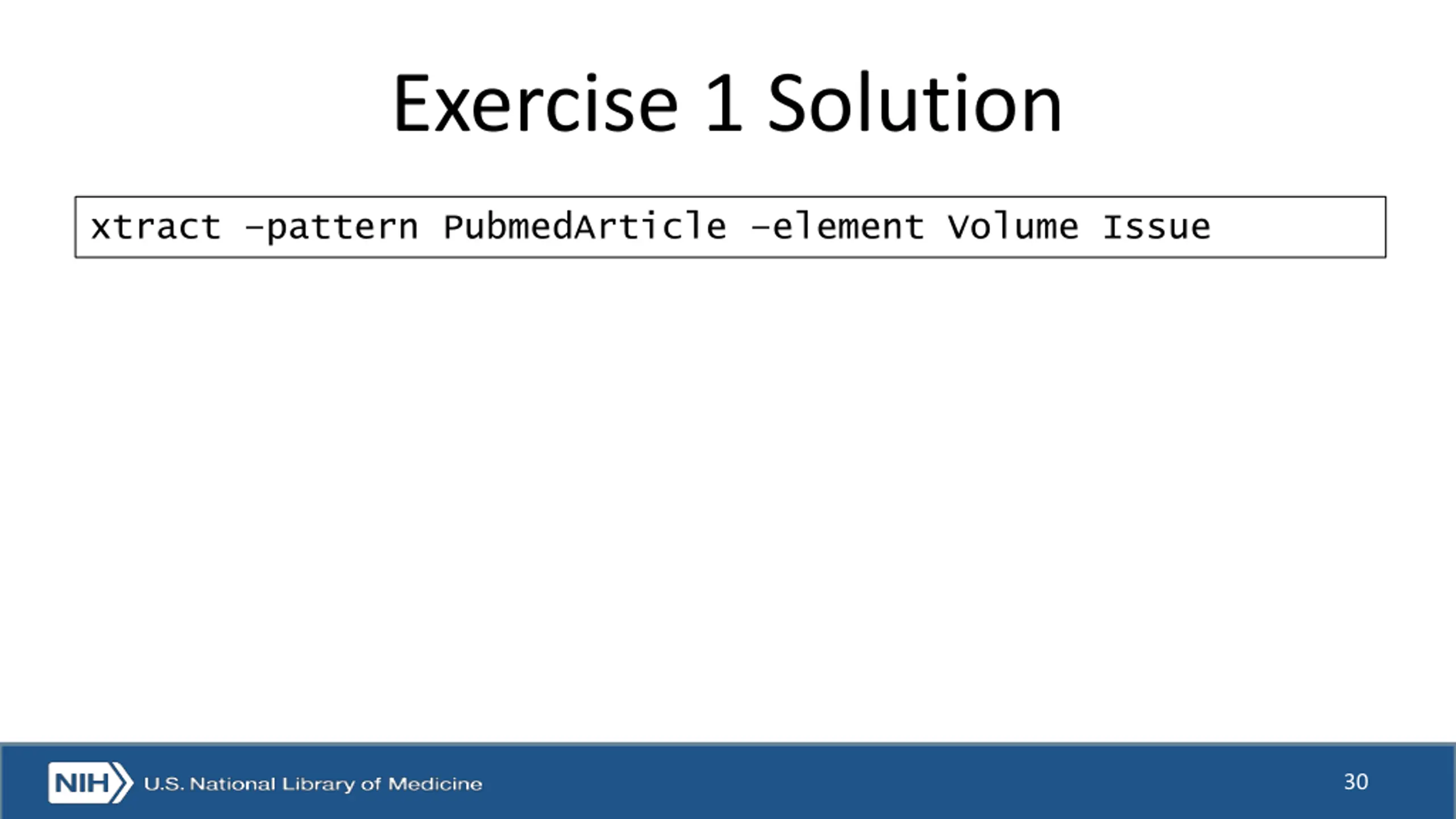 Exercise 1 Solution xtract pattern PubmedArticle element Volume Issue 30