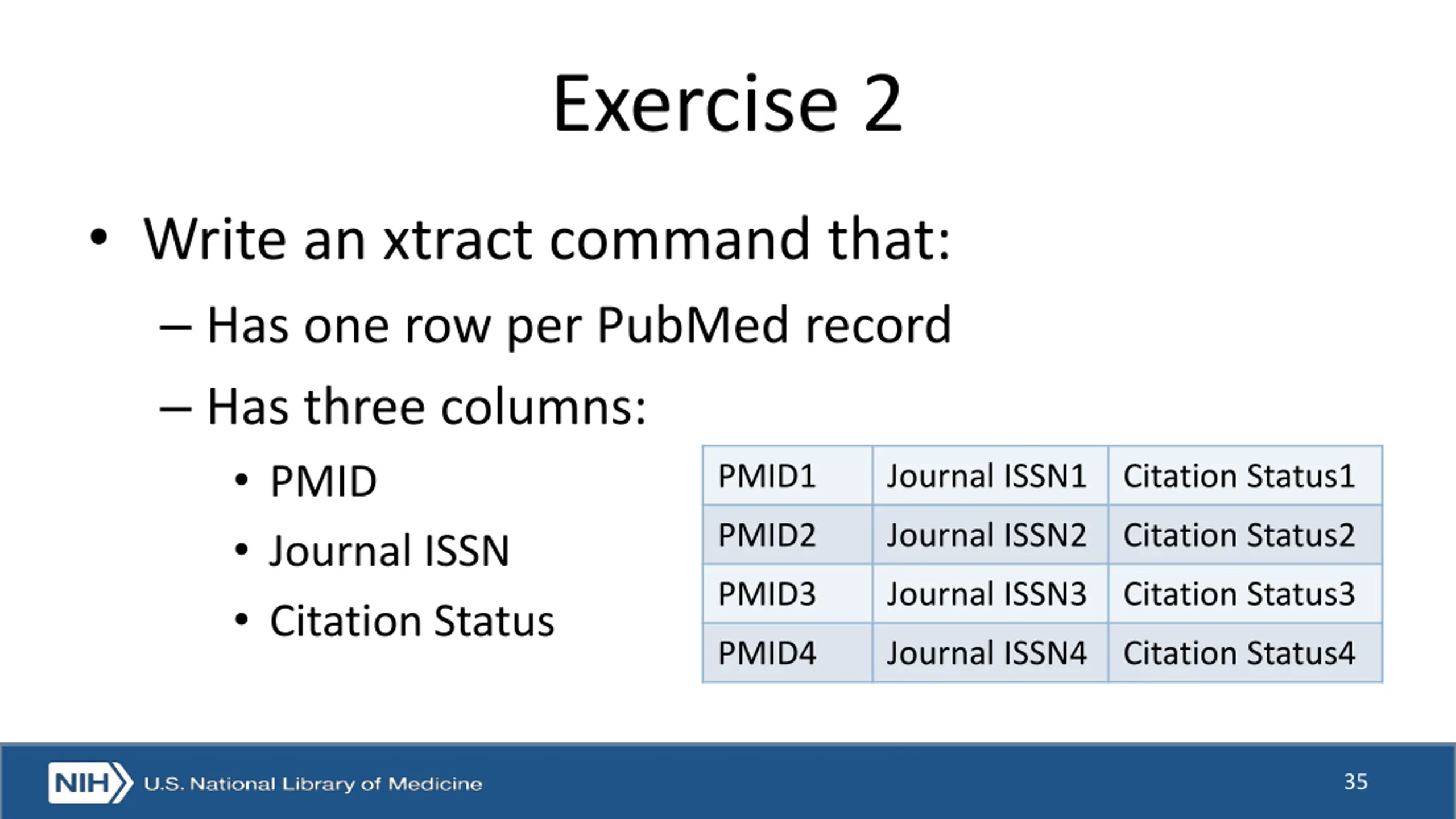 Exercise 2 Write an xtract command that: Has one row per PubMed record Has three columns: PMID Journal ISSN Citation Status PMID1 Journal ISSN1 Citation Status1 PMID2 Journal ISSN2 Citation Status2 PMID3 Journal ISSN3 Citation Status3 PMID4 Journal ISSN4 Citation Status4 35