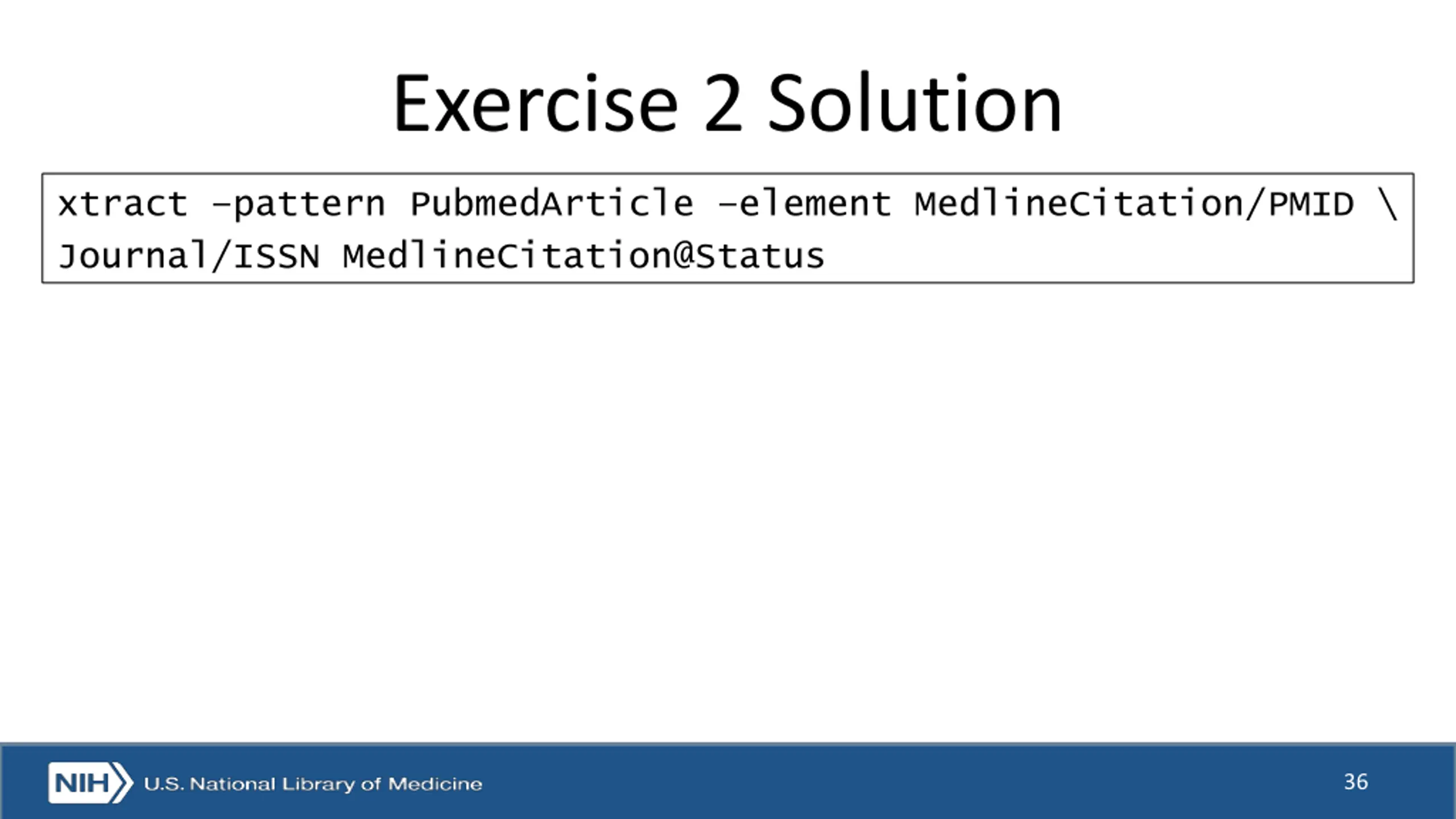 Exercise 2 Solution xtract pattern PubmedArticle element MedlineCitation/PMID \ Journal/ISSN MedlineCitation@Status 36
