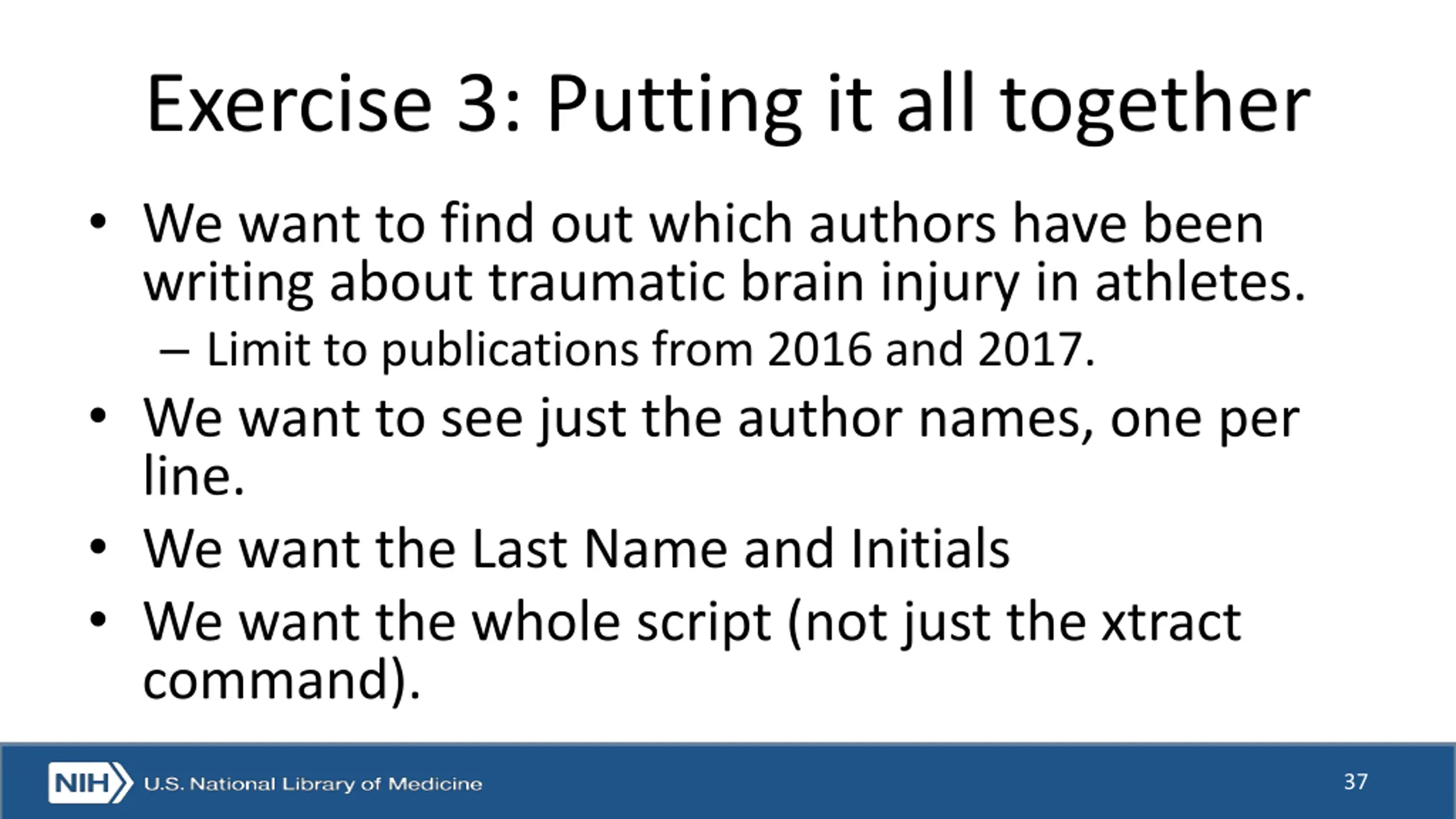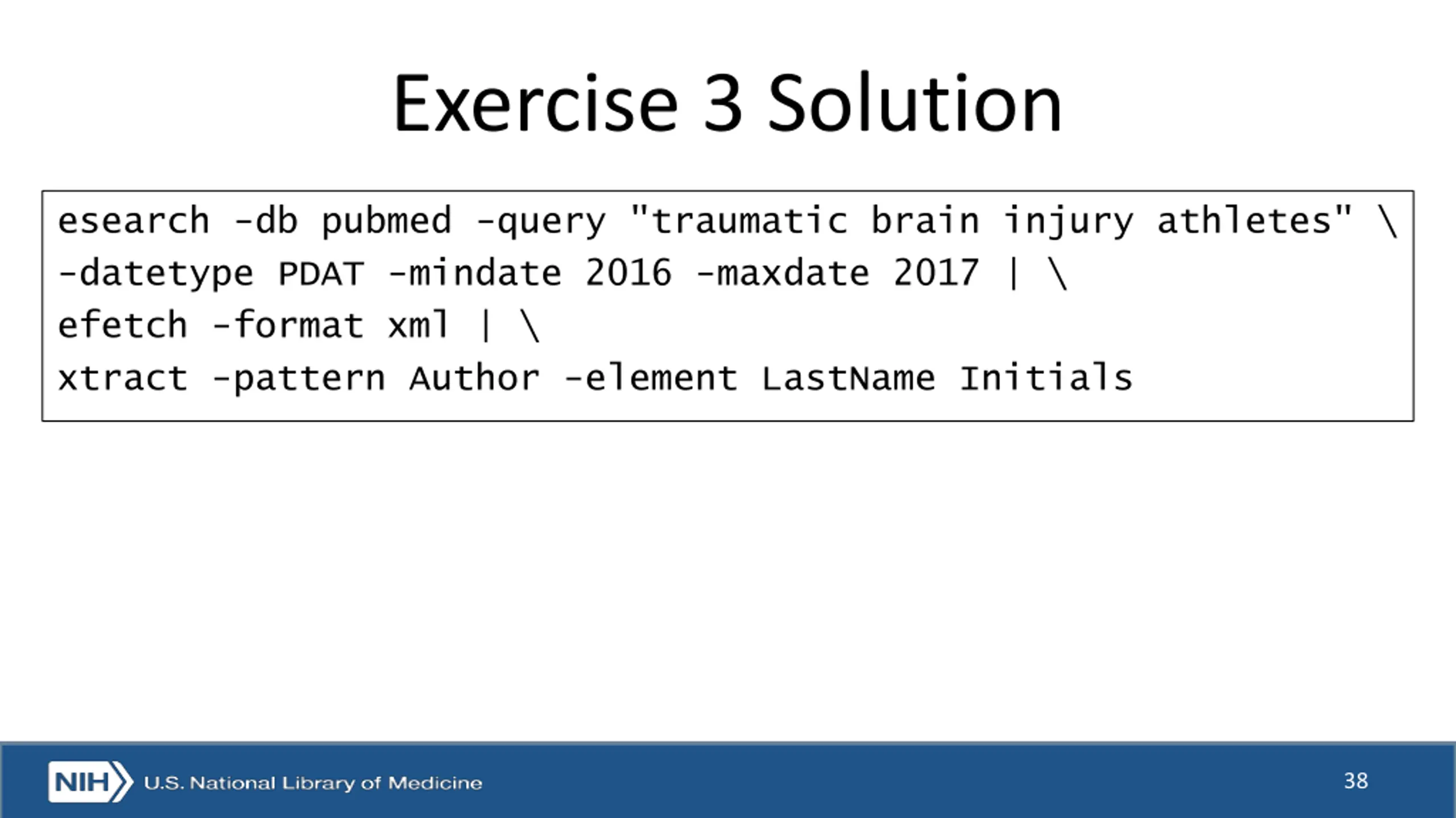 Exercise 3 Solution esearch -db pubmed -query "traumatic brain injury athletes" \ -datetype PDAT -mindate 2016 -maxdate 2017 | \ efetch -format xml | \ xtract -pattern Author -element LastName Initials 38