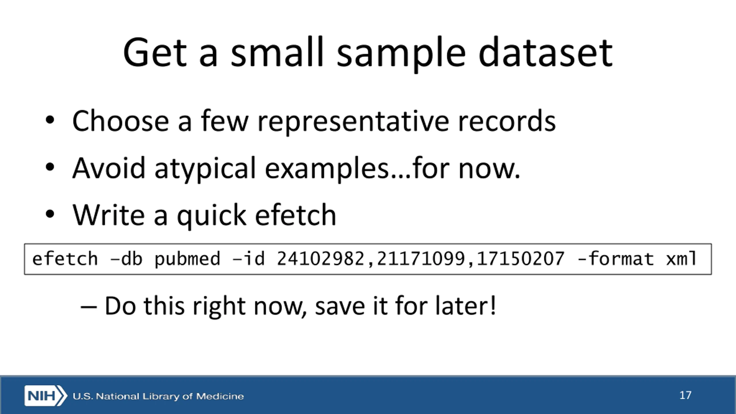 Get a small sample dataset Choose a few representative records Avoid atypical examples for now. Write a quick efetch efetch db pubmed id 24102982,21171099,17150207 -format xml Do this right now, save it for later! 17