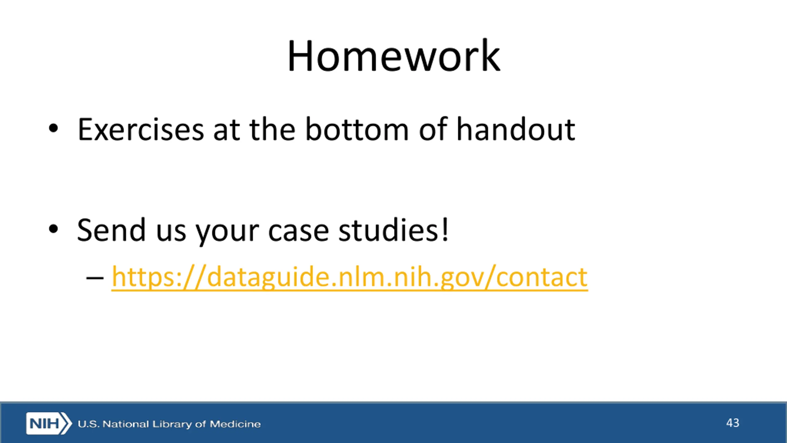 Homework Exercises at the bottom of handout Send us your case studies! https://dataguide.nlm.nih.gov/contact 43
