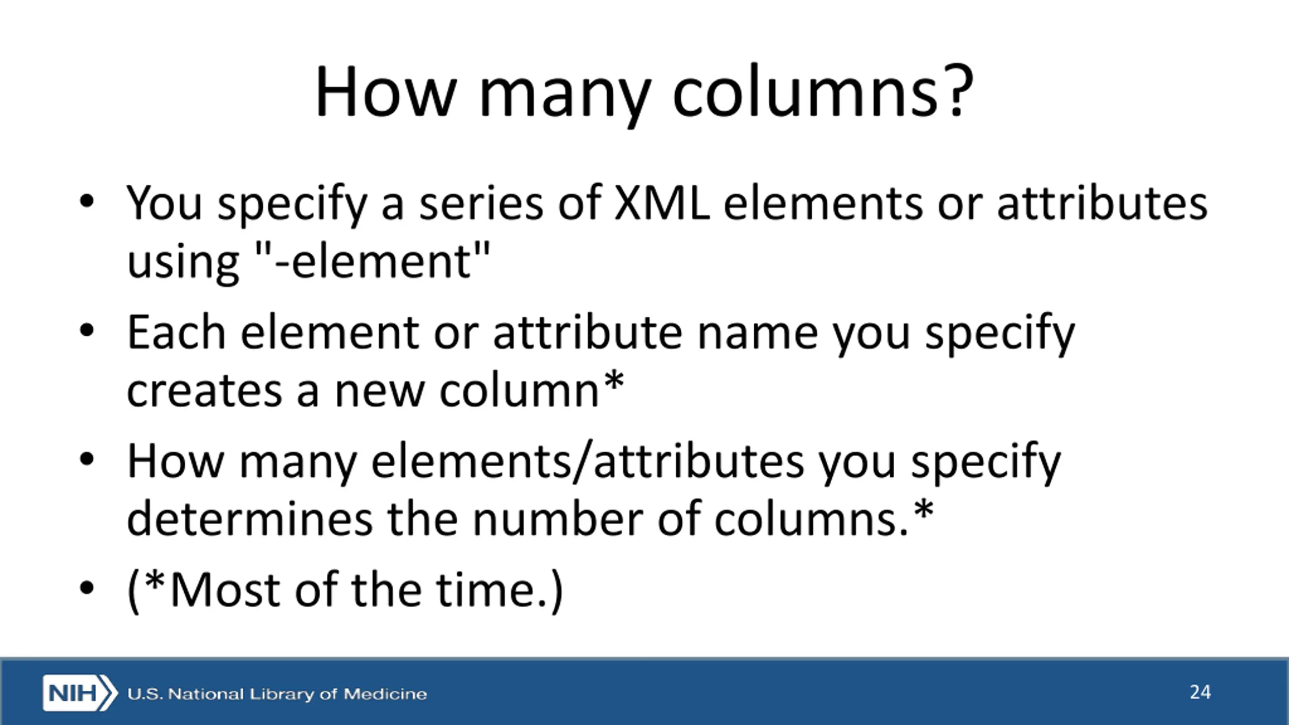 How many columns? You specify a series of XML elements or attributes using "-element" Each element or attribute name you specify creates a new column* How many elements/attributes you specify determines the number of columns.* (*Most of the time.) 24