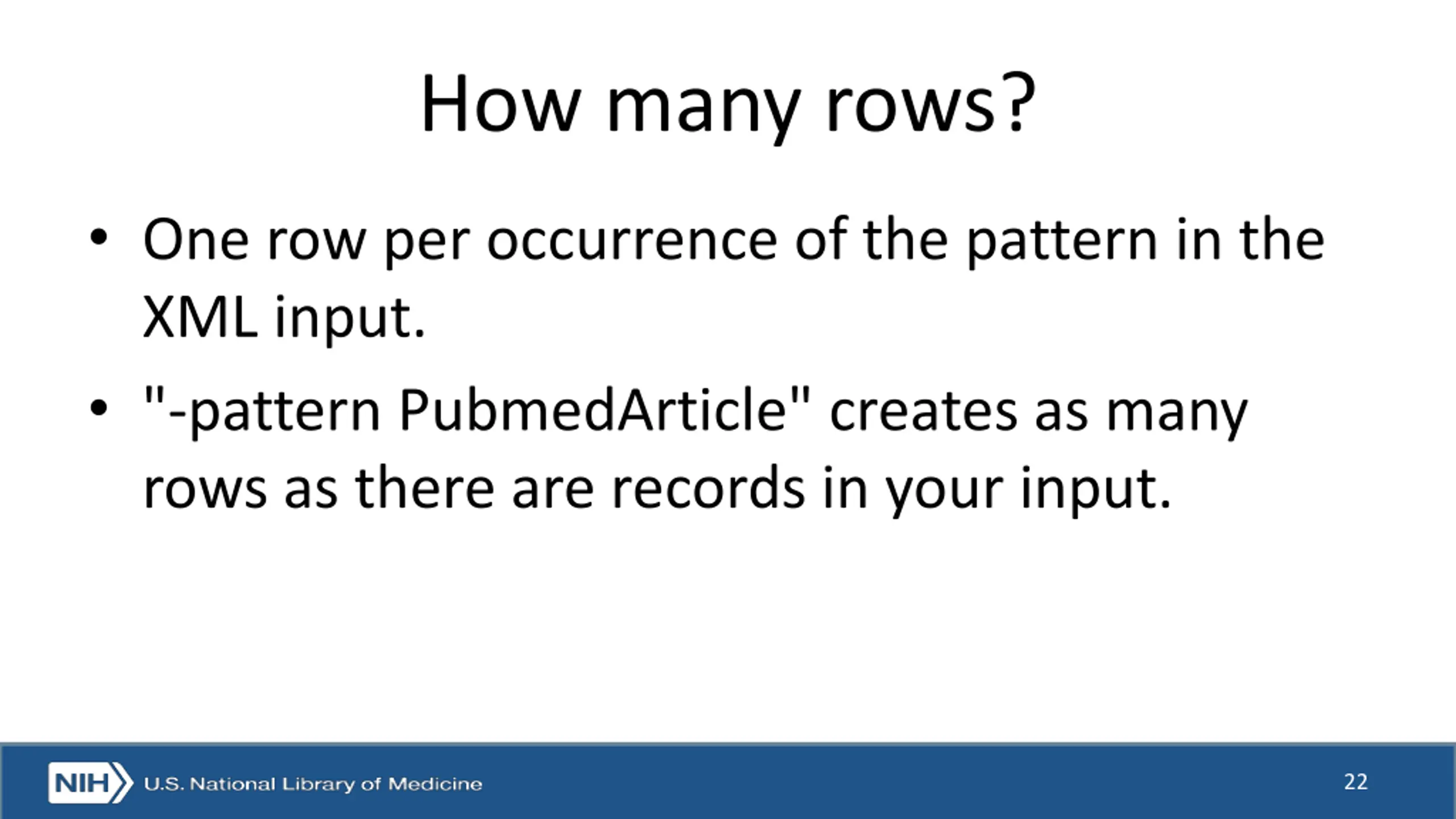 How many rows? One row per occurrence of the pattern in the XML input. "-pattern PubmedArticle" creates as many rows as there are records in your input. 22