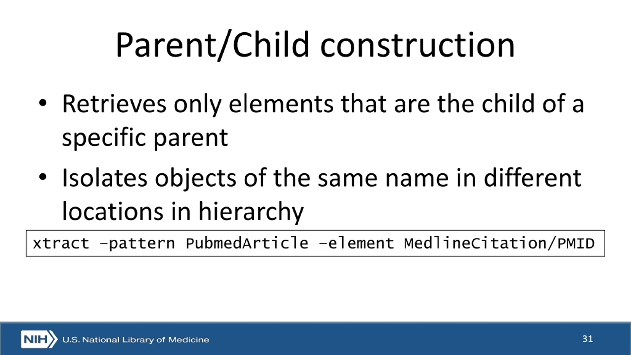 Parent/Child construction Retrieves only elements that are the child of a specific parent Isolates objects of the same name in different locations in hierarchy xtract pattern PubmedArticle element MedlineCitation/PMID 31