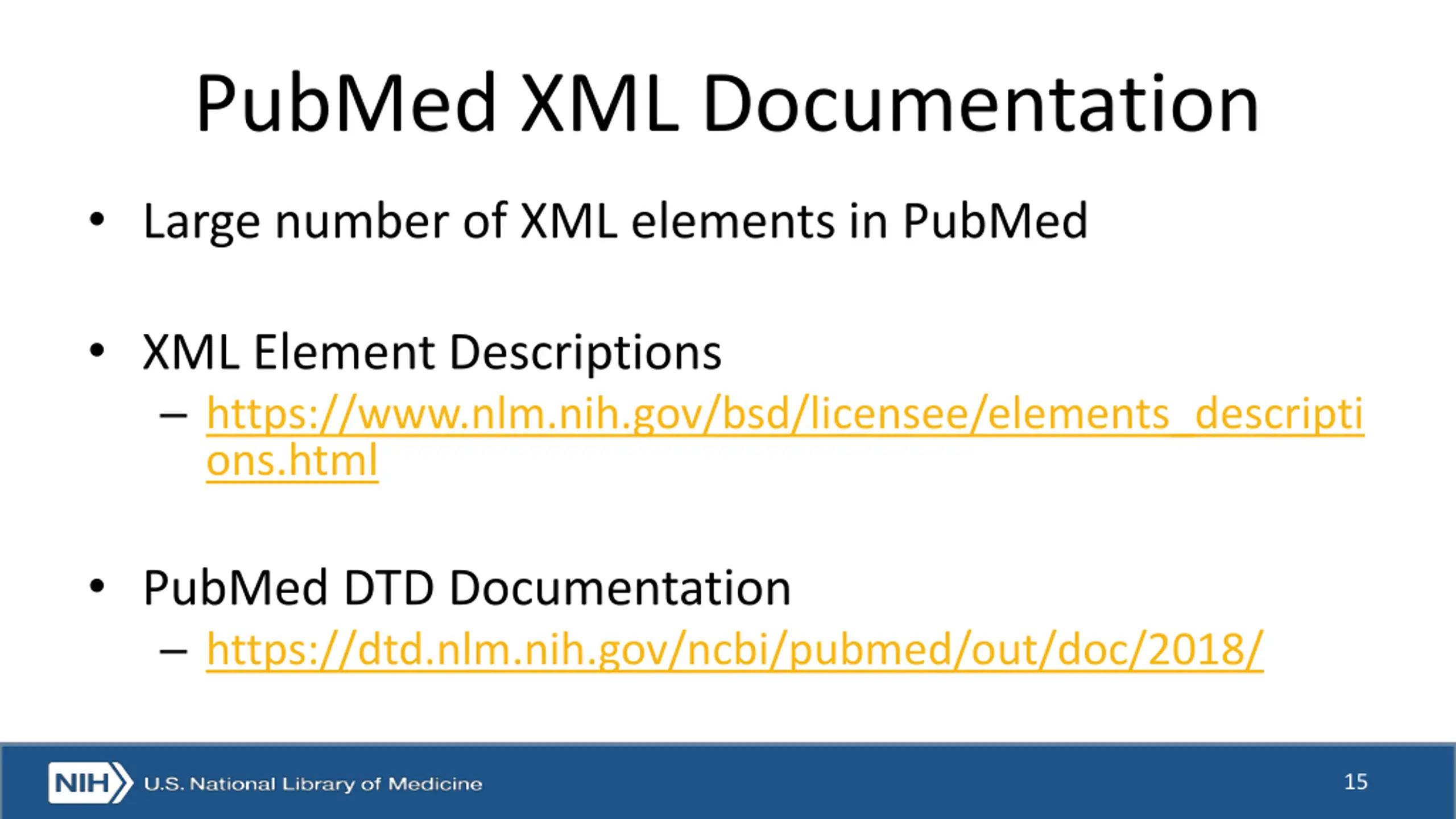 PubMed XML Documentation Large number of XML elements in PubMed XML Element Descriptions https://www.nlm.nih.gov/bsd/licensee/elements_descripti ons.html PubMed DTD Documentation https://dtd.nlm.nih.gov/ncbi/pubmed/out/doc/2018/ 15