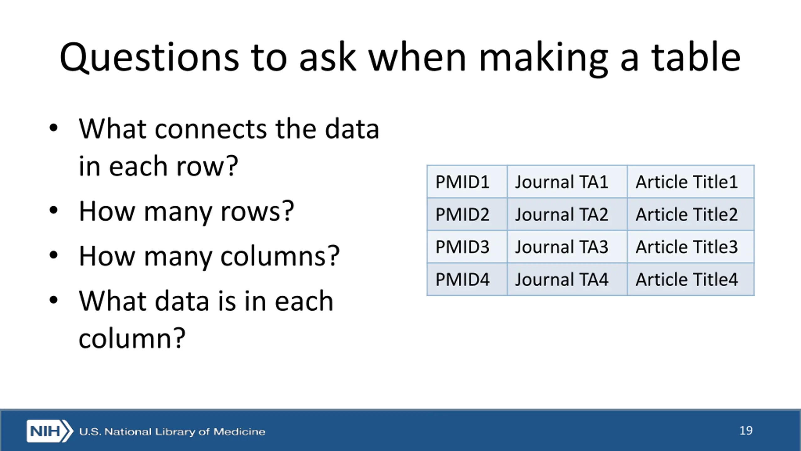 Questions to ask when making a table What connects the data in each row? How many rows? How many columns? What data is in each column? PMID1 Journal TA1 Article Title1 PMID2 Journal TA2 Article Title2 PMID3 Journal TA3 Article Title3 PMID4 Journal TA4 Article Title4 19