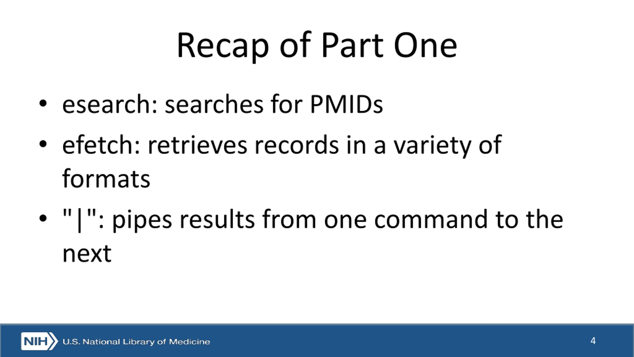 Recap of Part One esearch: searches for PMIDs efetch: retrieves records in a variety of formats "|": pipes results from one command to the next 4