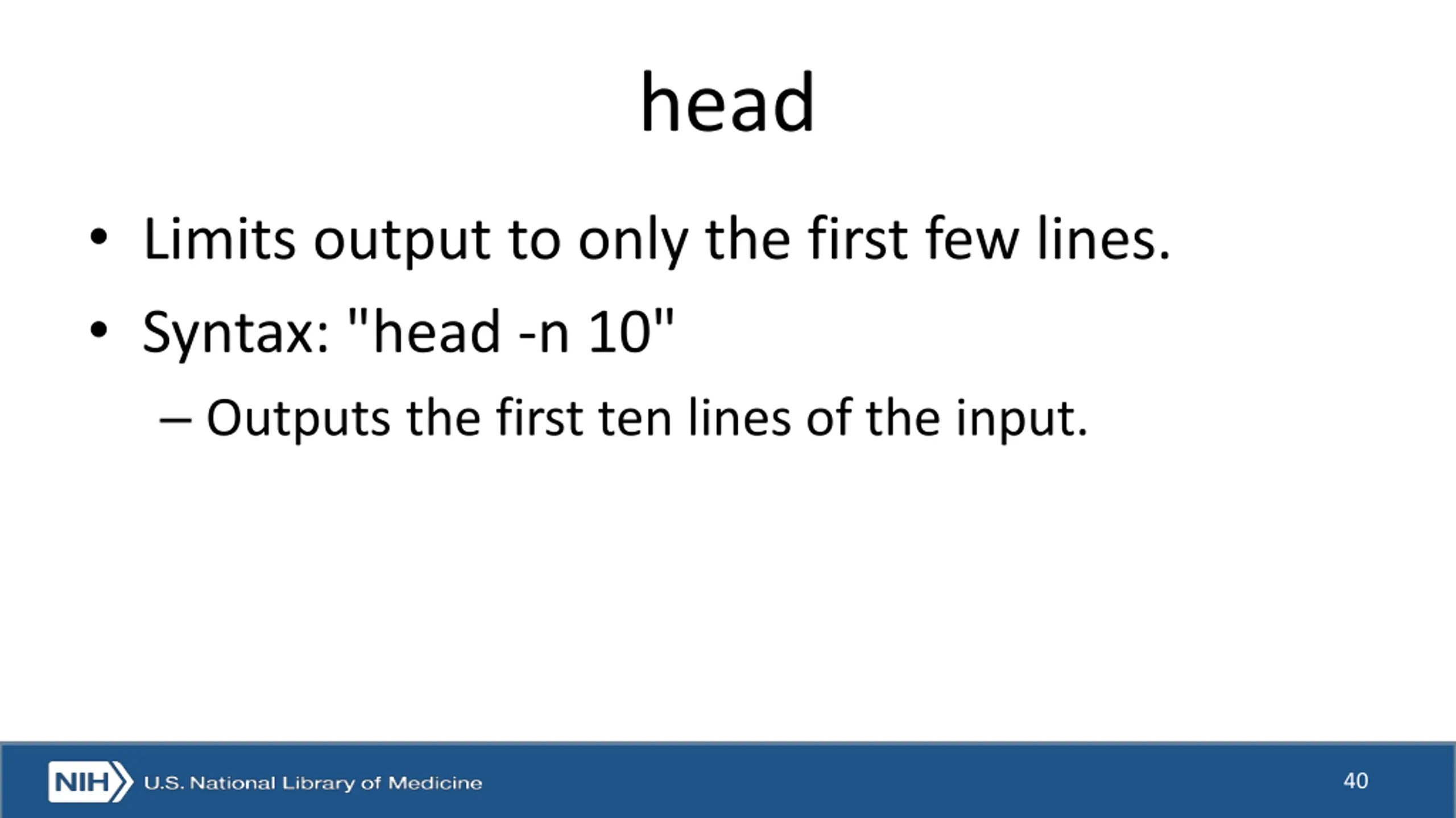head Limits output to only the first few lines. Syntax: "head -n 10" Outputs the first ten lines of the input. 40