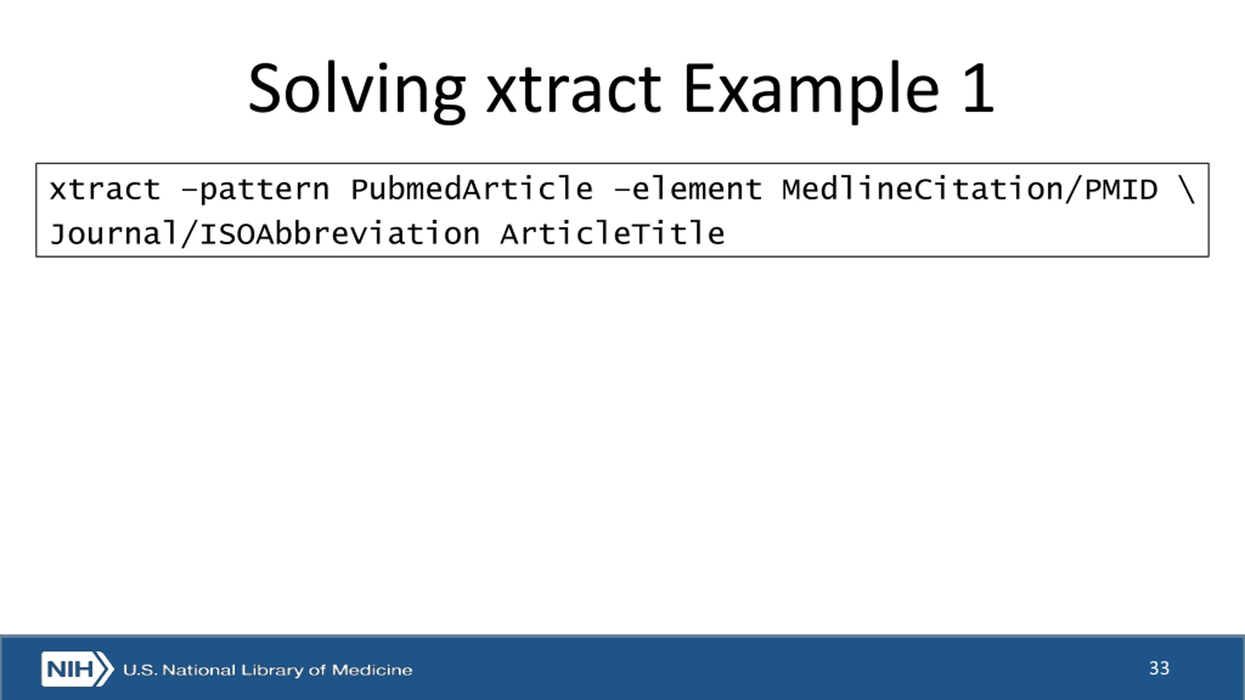 Solving xtract Example 1 xtract pattern PubmedArticle element MedlineCitation/PMID \ Journal/ISOAbbreviation ArticleTitle 33