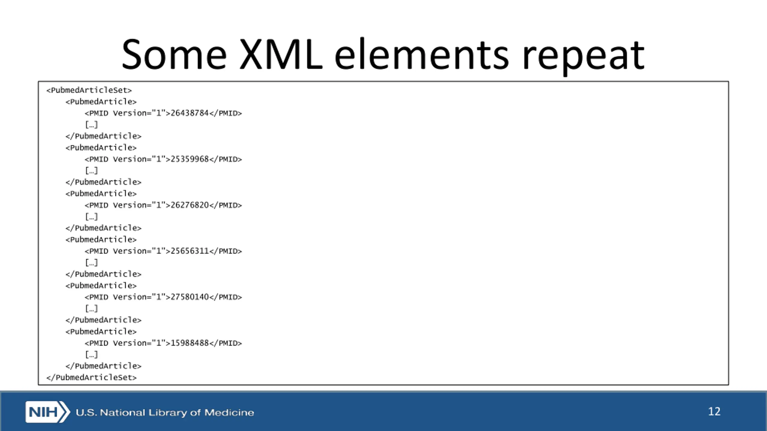 Some XML elements repeat <PubmedArticleSet> <PubmedArticle> <PMID Version="1">26438784</PMID> [ ] </PubmedArticle> <PubmedArticle> <PMID Version="1">25359968</PMID> [ ] </PubmedArticle> <PubmedArticle> <PMID Version="1">26276820</PMID> [ ] </PubmedArticle> <PubmedArticle> <PMID Version="1">25656311</PMID> [ ] </PubmedArticle> <PubmedArticle> <PMID Version="1">27580140</PMID> [ ] </PubmedArticle> <PubmedArticle> <PMID Version="1">15988488</PMID> [ ] </PubmedArticle> </PubmedArticleSet> 12