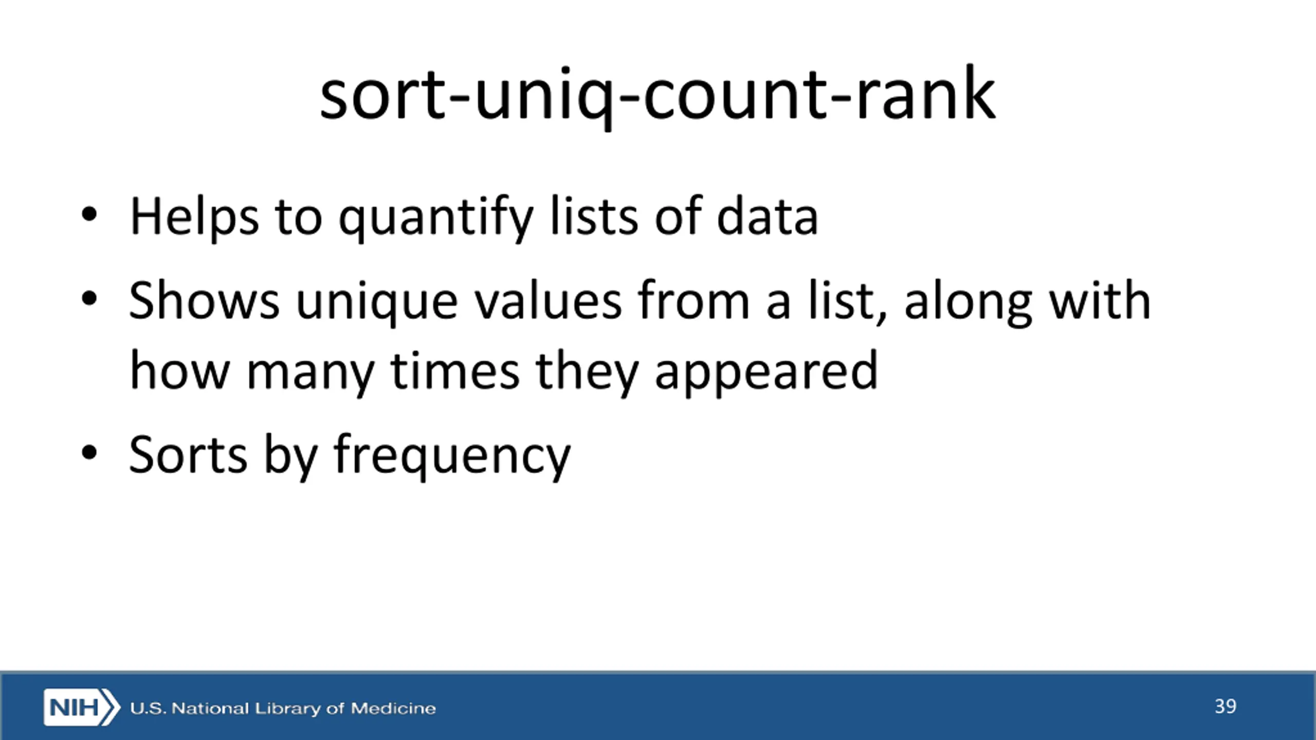 sort-uniq-count-rank Helps to quantify lists of data Shows unique values from a list, along with how many times they appeared Sorts by frequency 39