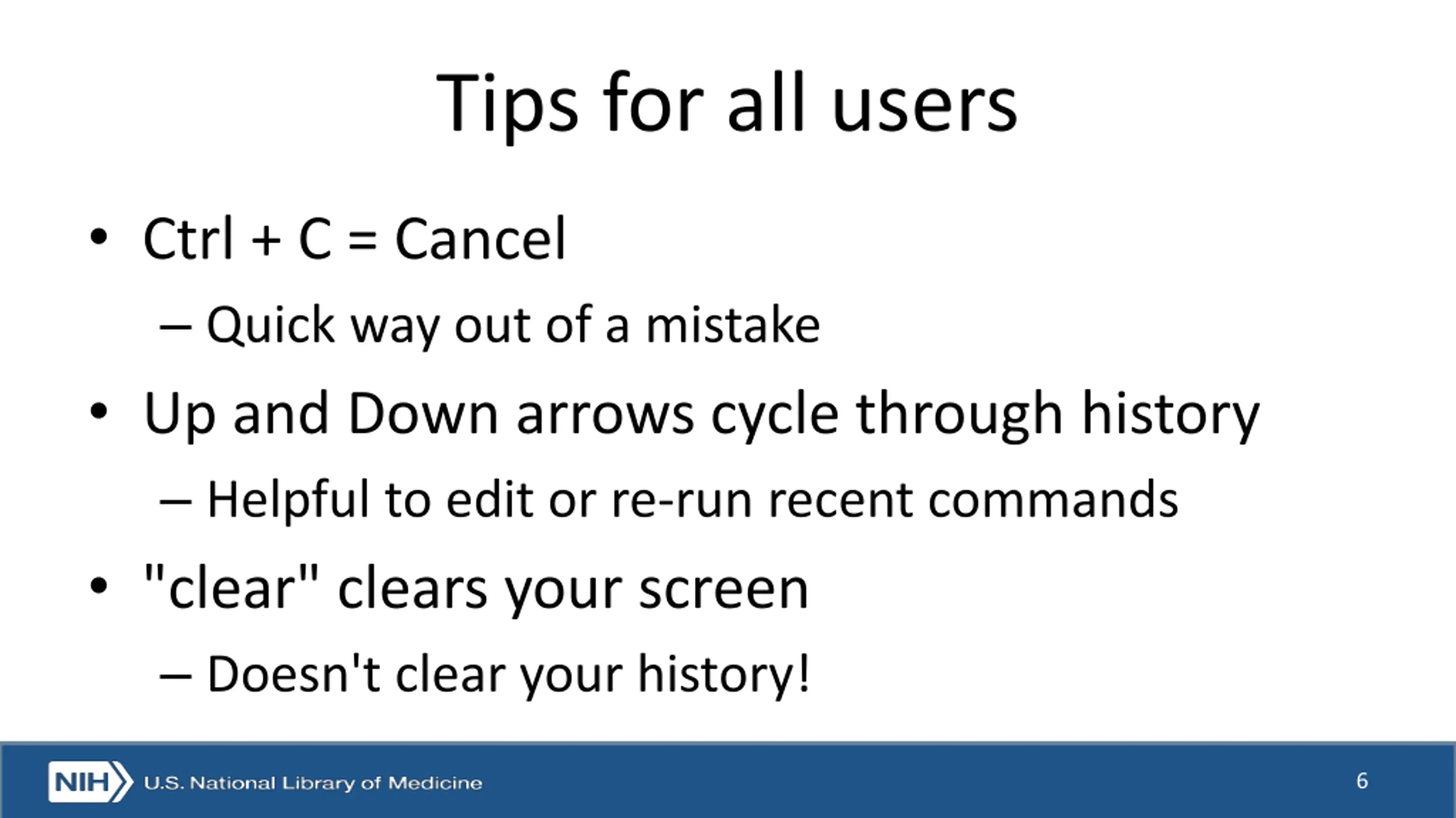 Tips for all users Ctrl + C = Cancel Quick way out of a mistake Up and Down arrows cycle through history Helpful to edit or re-run recent commands "clear" clears your screen Doesn't clear your history! 6