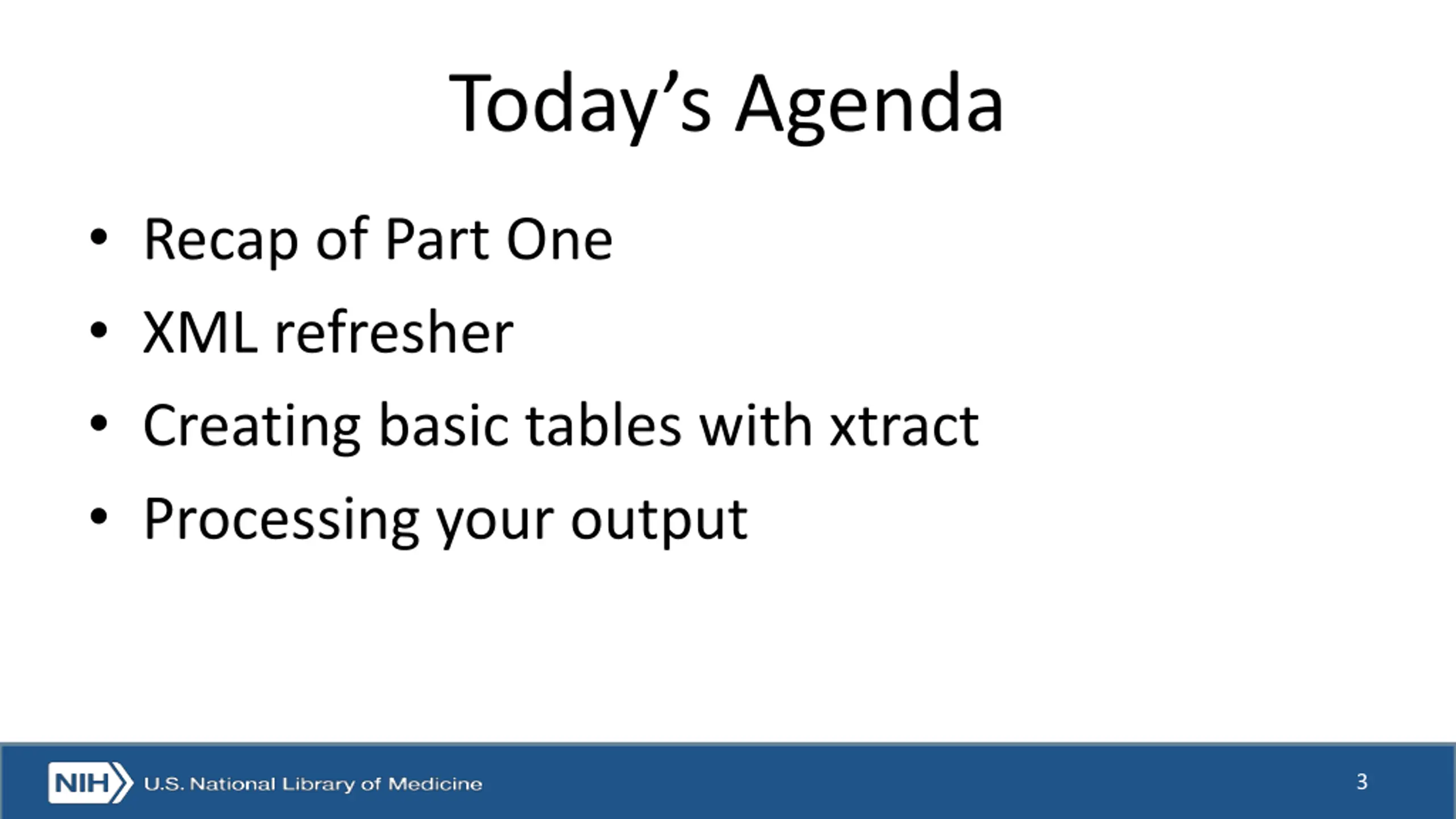 Todays Agenda Recap of Part One XML refresher Creating basic tables with xtract Processing your output 3
