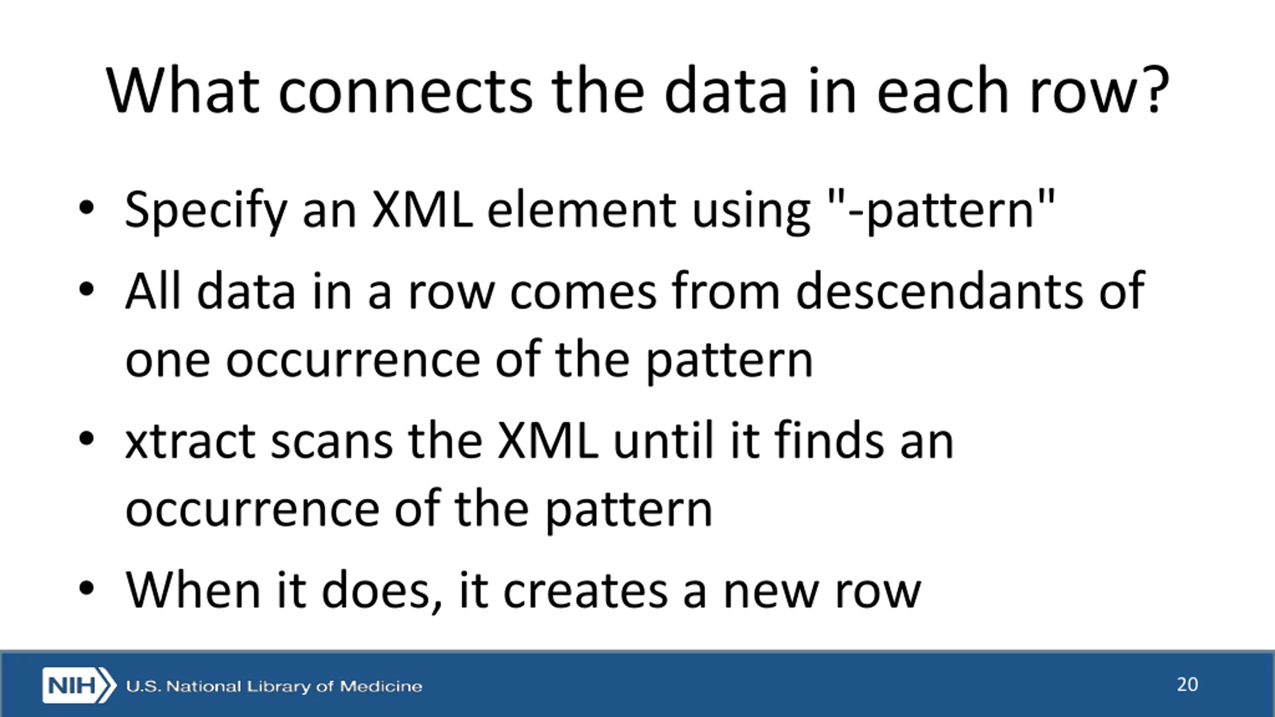 What connects the data in each row? Specify an XML element using "-pattern" All data in a row comes from descendants of one occurrence of the pattern xtract scans the XML until it finds an occurrence of the pattern When it does, it creates a new row 20