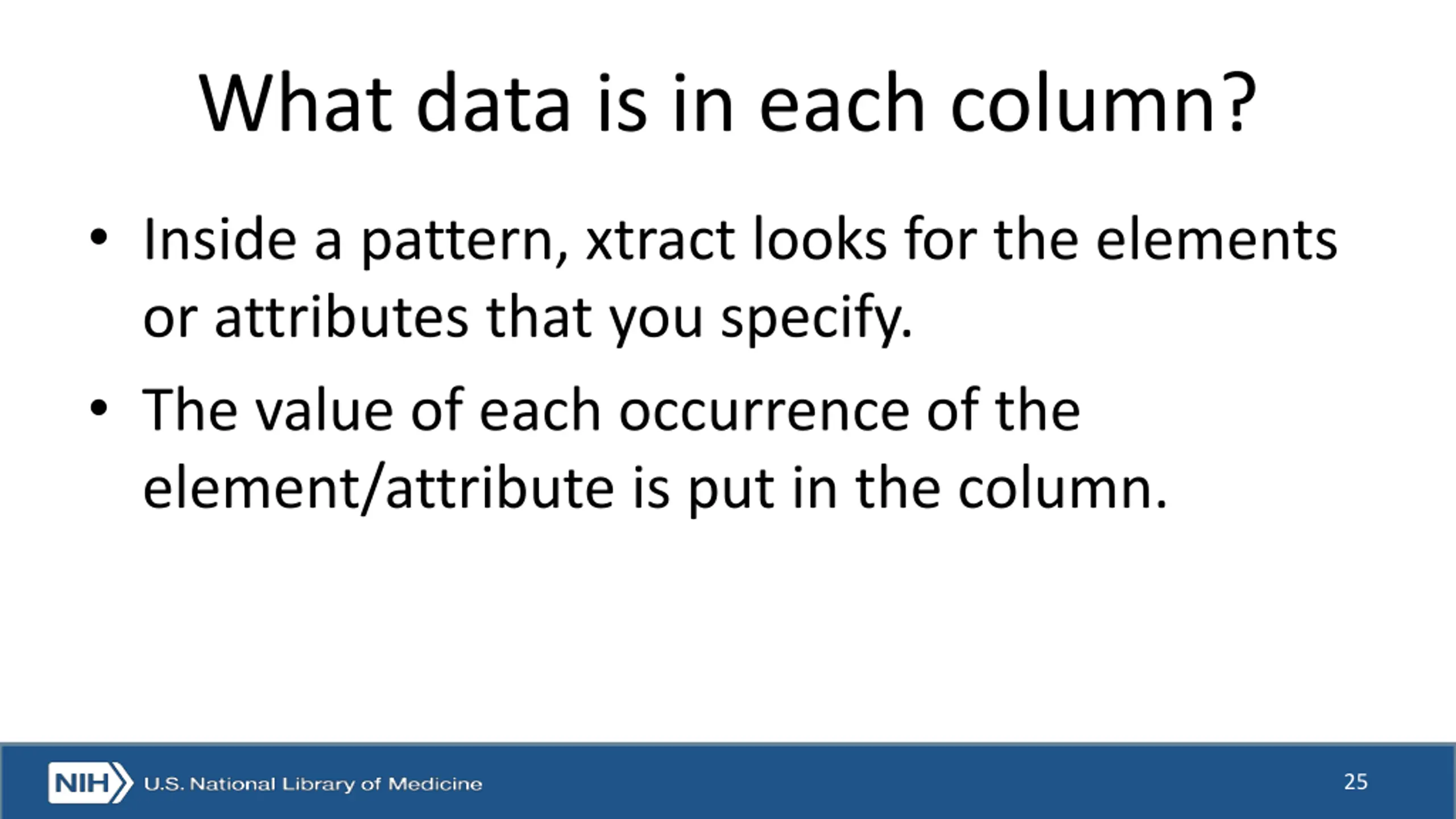 What data is in each column? Inside a pattern, xtract looks for the elements or attributes that you specify. The value of each occurrence of the element/attribute is put in the column. 25
