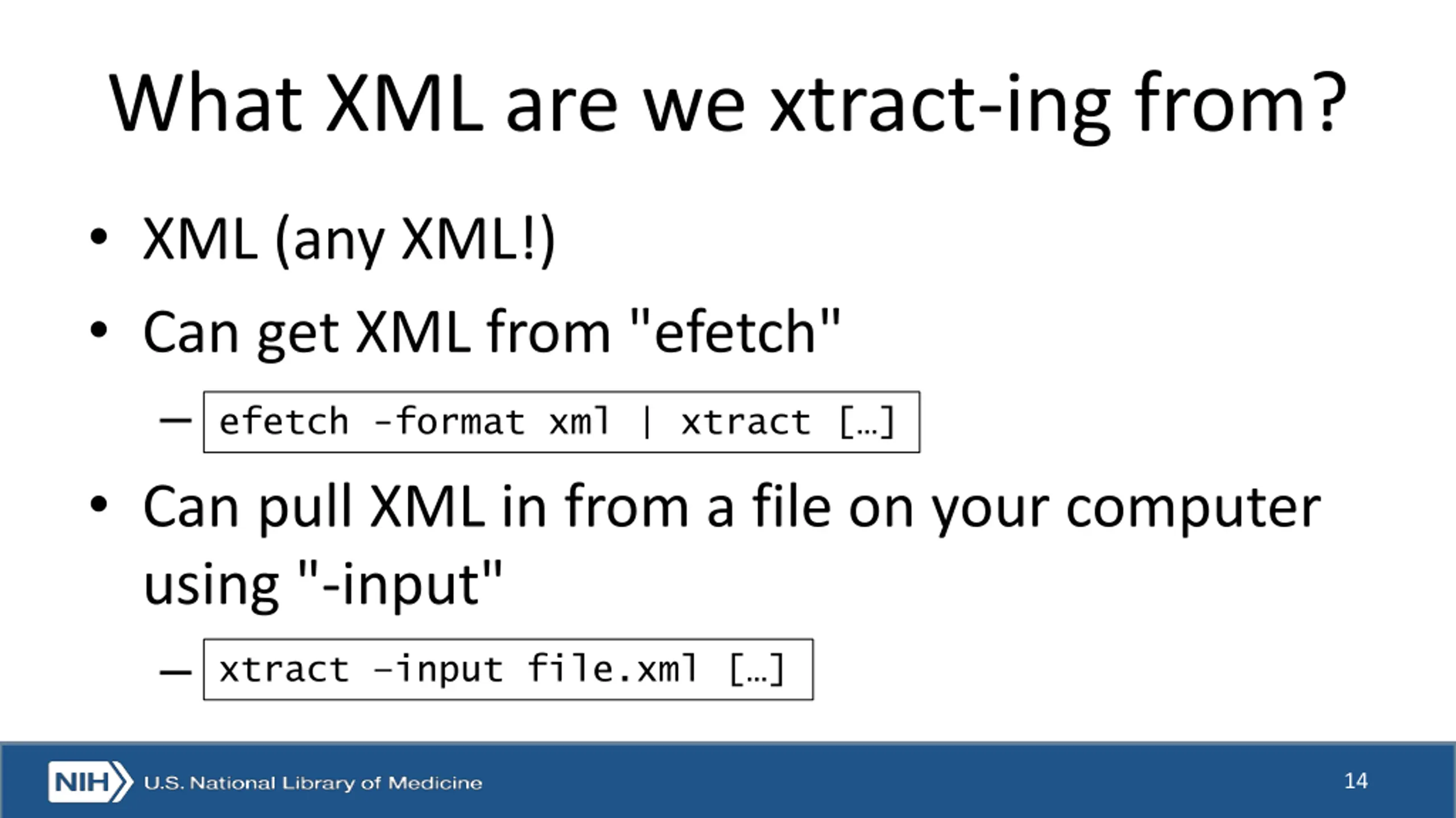 What XML are we xtract-ing from? XML (any XML!) Can get XML from "efetch" Can pull XML in from a file on your computer using "-input" xtract input file.xml [ ] efetch -format xml | xtract [ ] 14