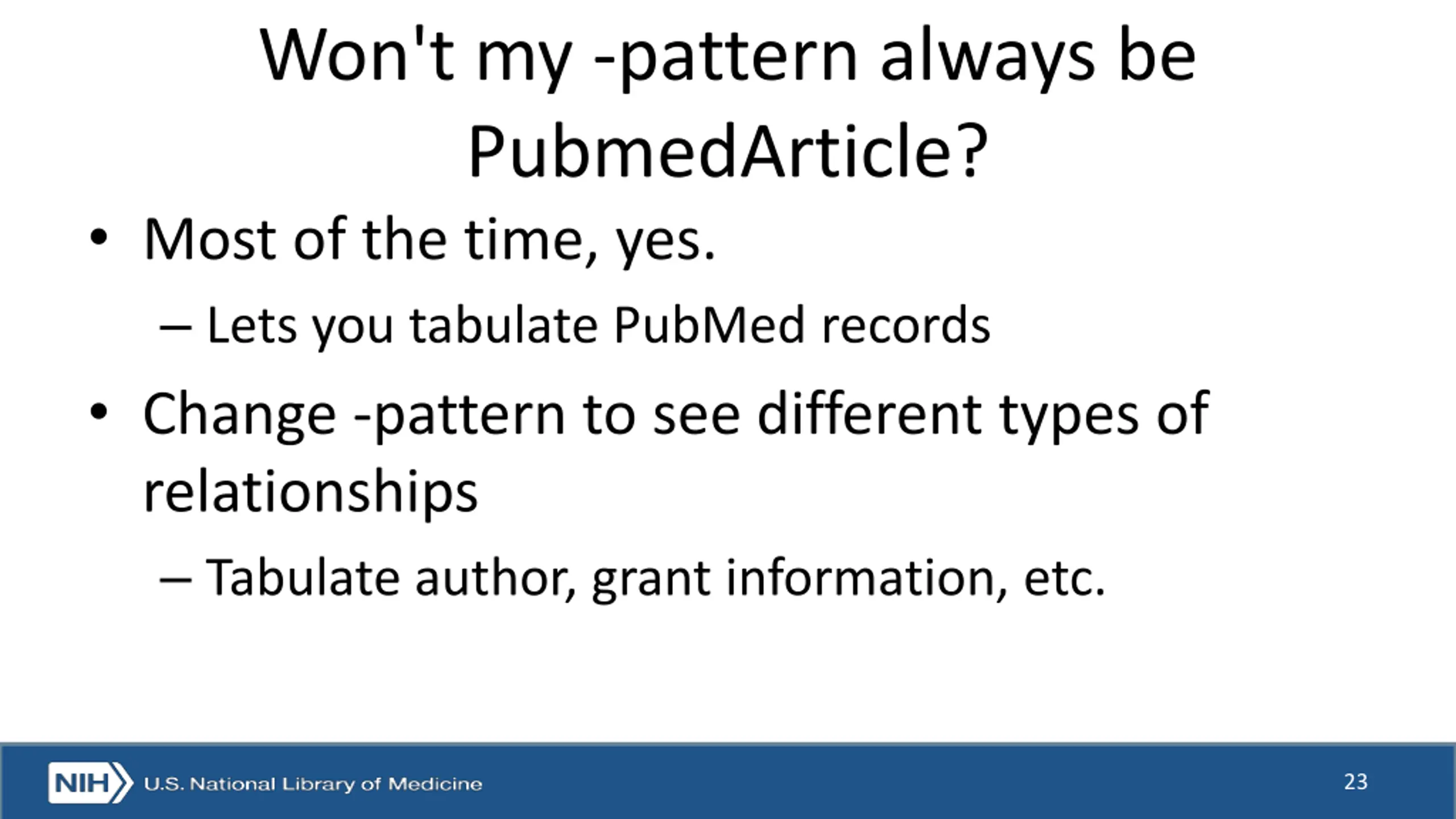 Won't my -pattern always be PubmedArticle? Most of the time, yes. Lets you tabulate PubMed records Change -pattern to see different types of relationships Tabulate author, grant information, etc. 23