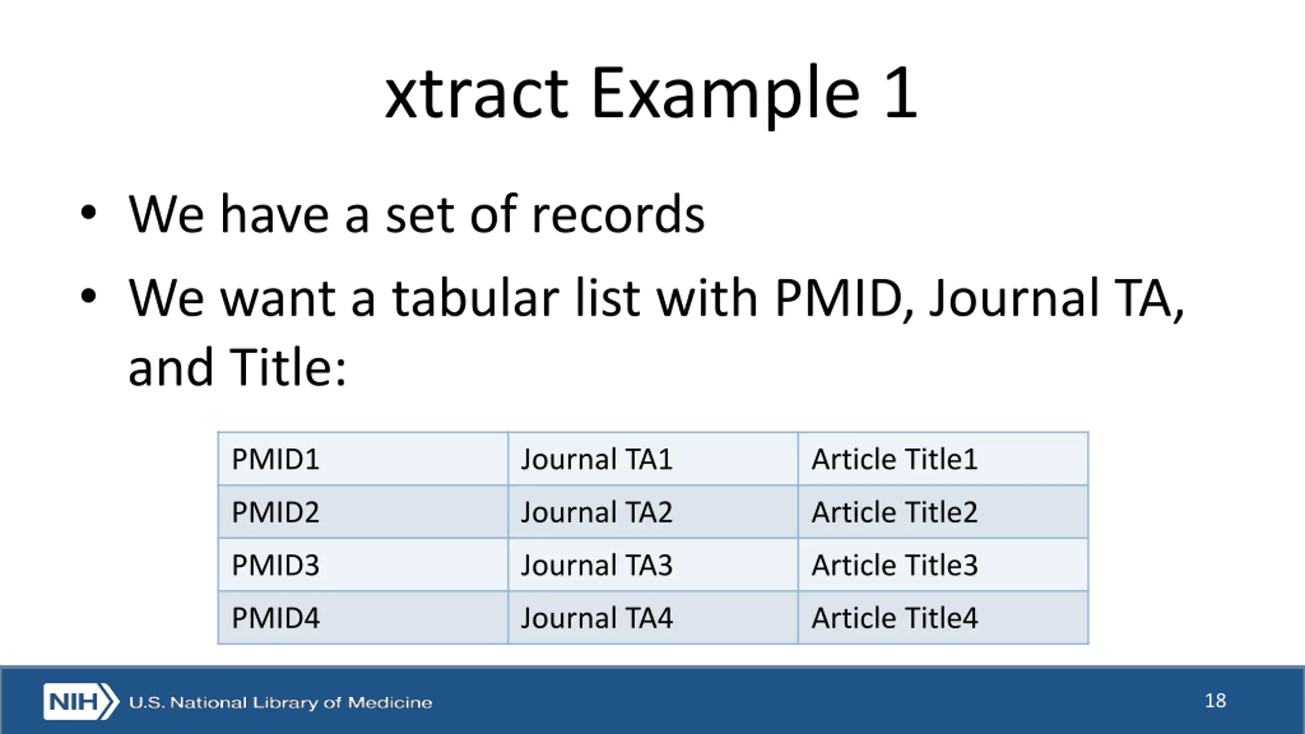 xtract Example 1 We have a set of records We want a tabular list with PMID, Journal TA, and Title: PMID1 Journal TA1 Article Title1 PMID2 Journal TA2 Article Title2 PMID3 Journal TA3 Article Title3 PMID4 Journal TA4 Article Title4 18