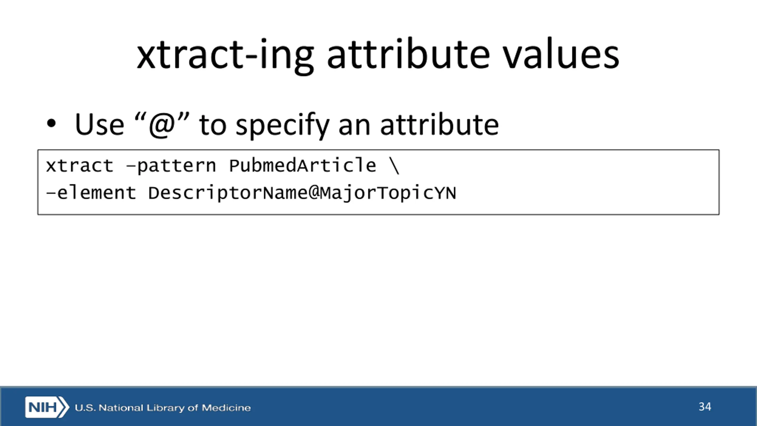 xtract-ing attribute values Use @ to specify an attribute xtract pattern PubmedArticle \ element DescriptorName@MajorTopicYN 34