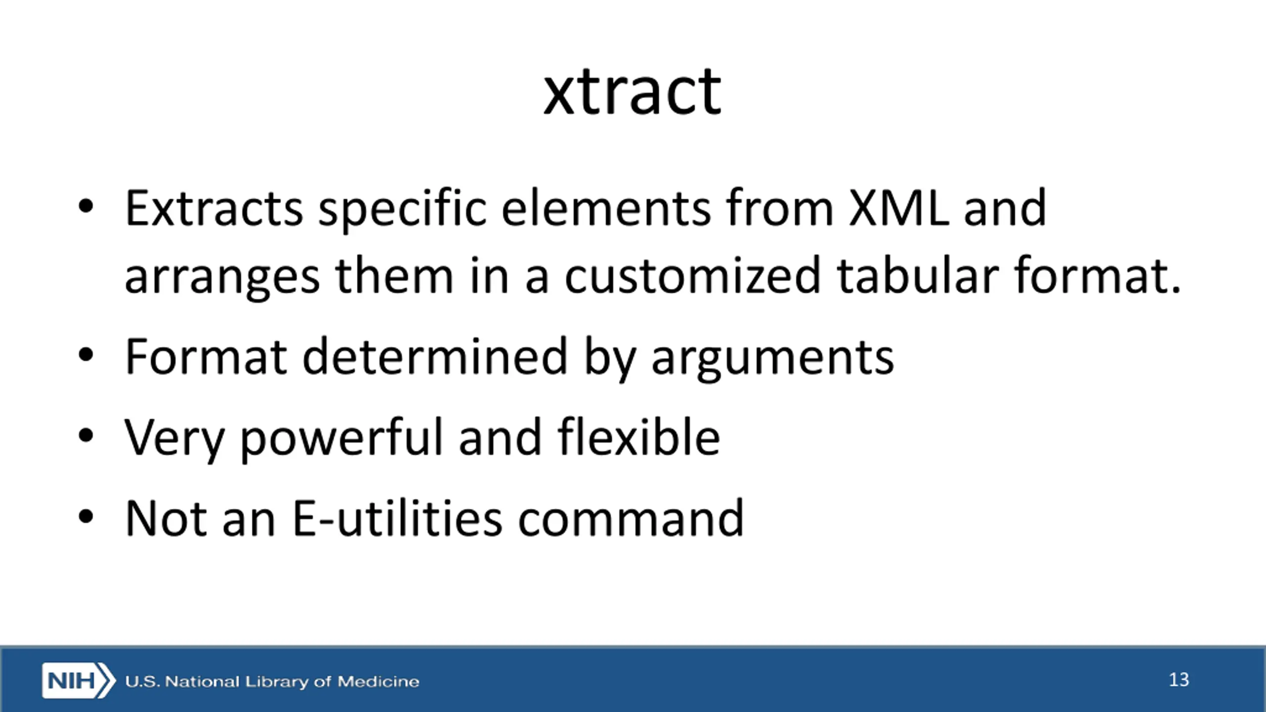 xtract Extracts specific elements from XML and arranges them in a customized tabular format. Format determined by arguments Very powerful and flexible Not an E-utilities command 13