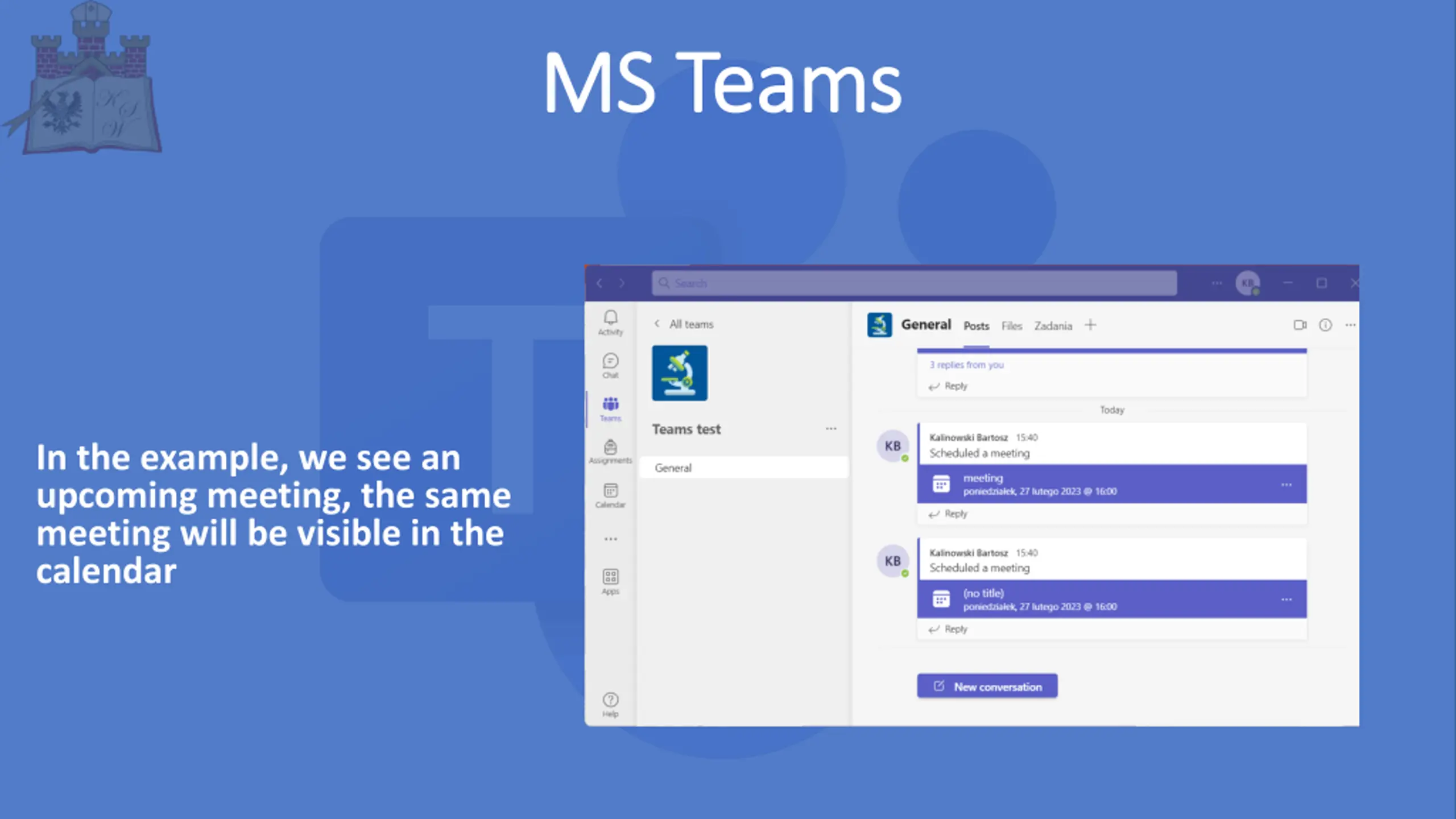 MS MS Teams Teams In the example, we see an upcoming meeting, the same meeting will be visible in the calendar