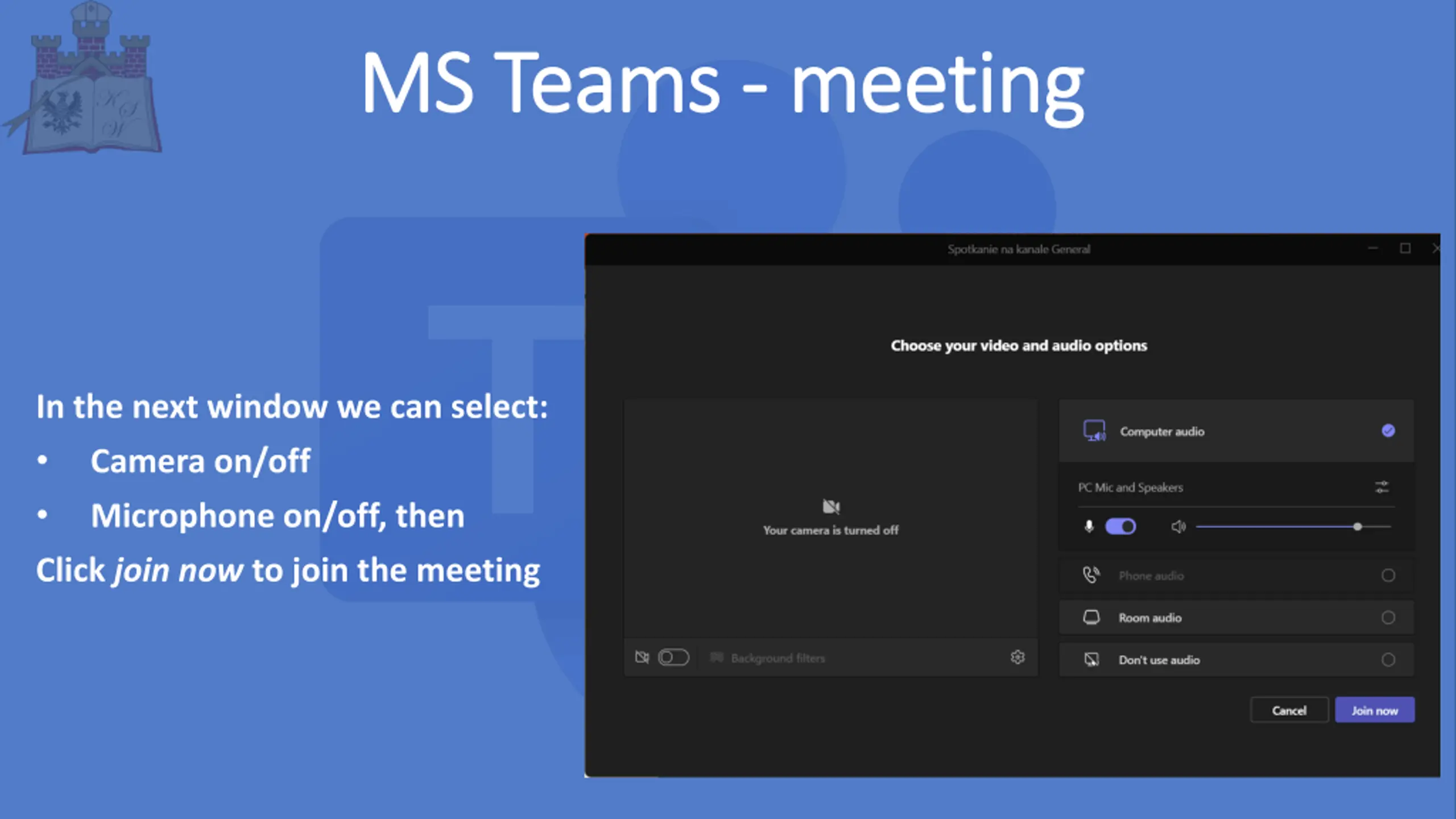 MS MS Teams Teams - - meeting meeting In the next window we can select: Camera on/off Microphone on/off, then Click join now to join the meeting